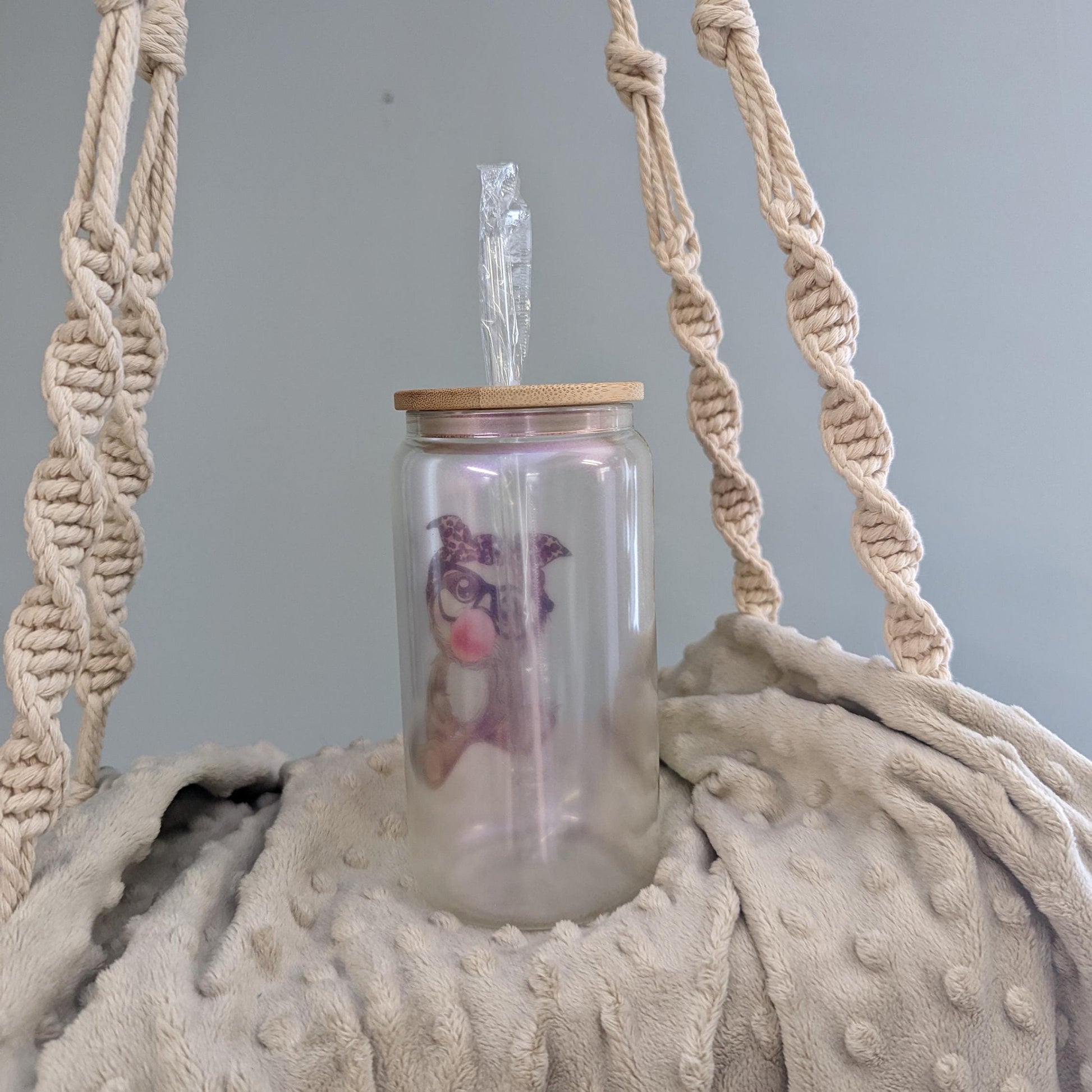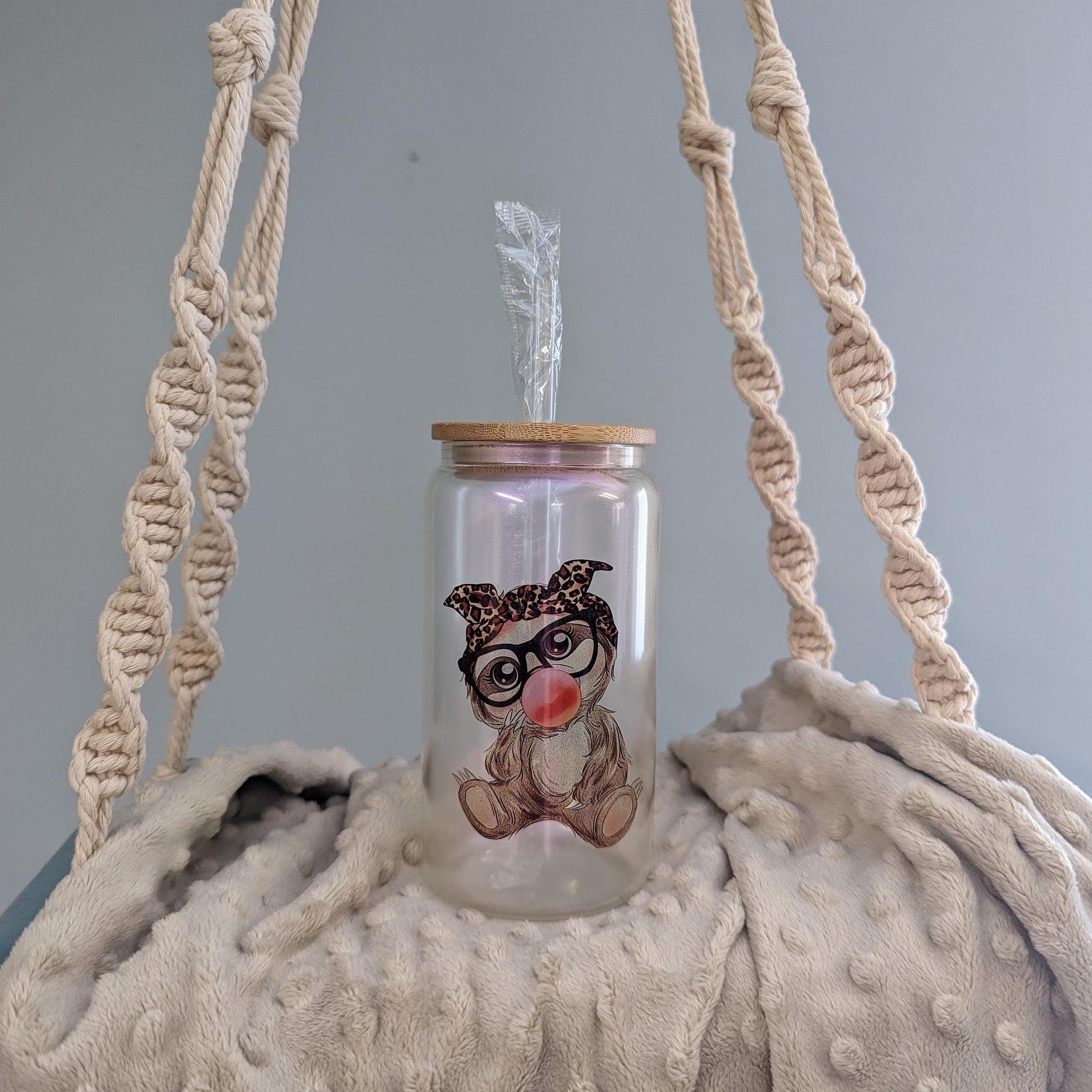 Add a pop of sweetness to your drink routine with this Bubblegum Sloth Glass Can! This 16oz frosted-style glass features an irresistibly cute sloth wearing glasses, blowing a pink bubblegum bubble, and rocking a leopard-print bow. It’s trendy, fun, and perfect for anyone who loves cute aesthetic drinkware.