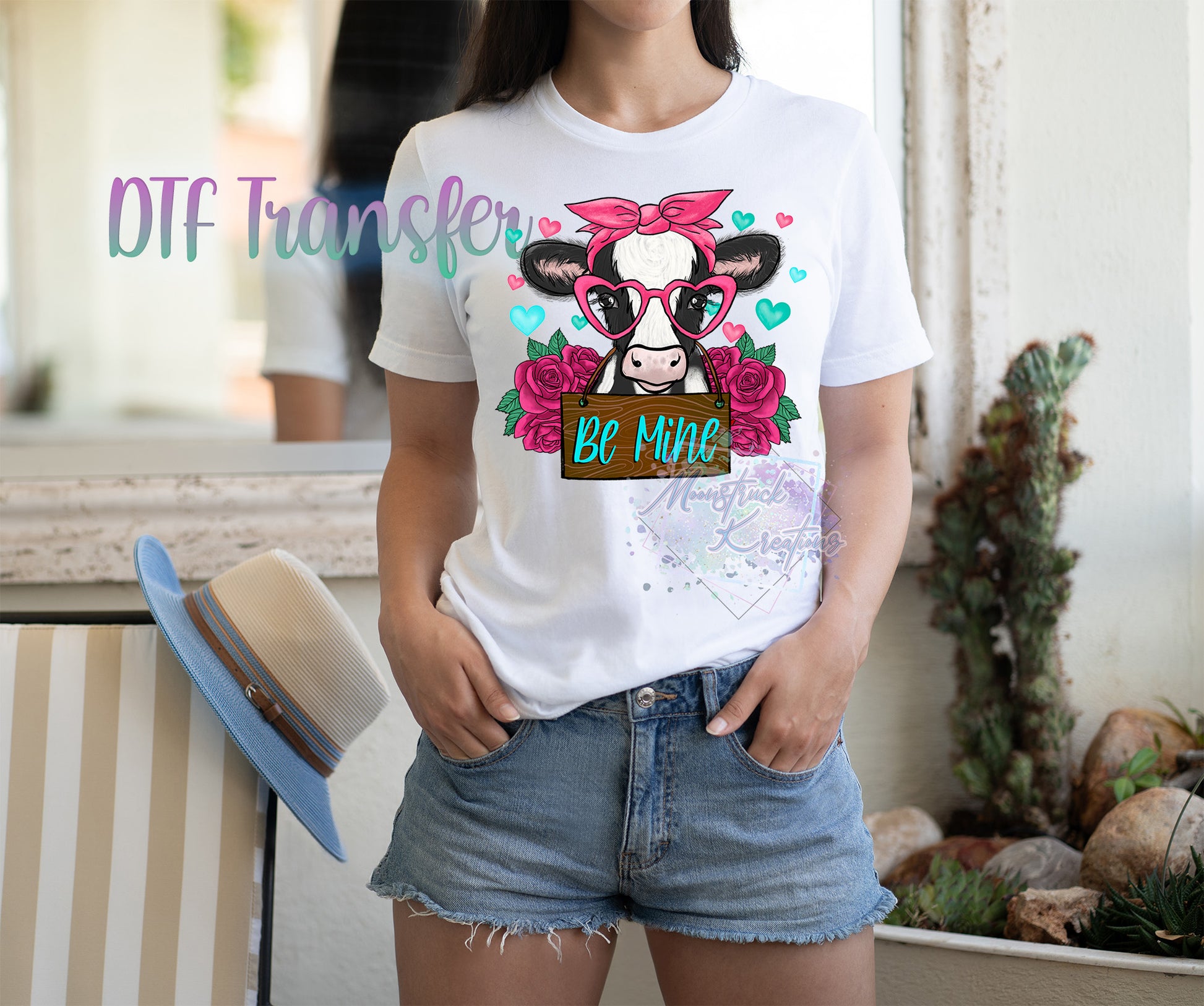 Spread the love with this adorable “Be Mine” Cow DTF Transfer! Featuring a sweet cow wearing heart-shaped glasses, a pink bandana, and surrounded by roses and hearts, this vibrant design is perfect for Valentine’s Day tees or gifts that say moo-ch love!