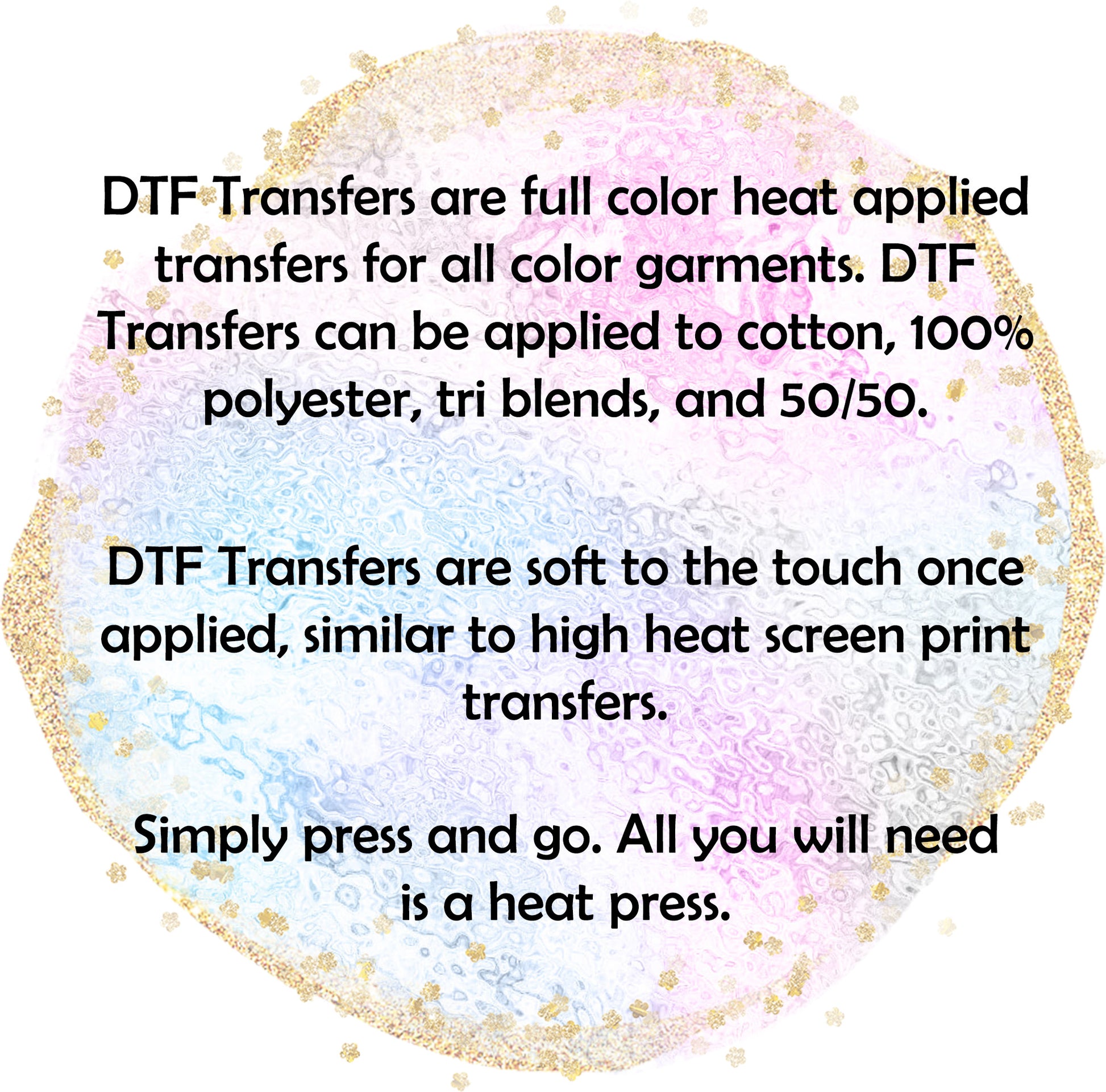 This listing is for a single DTF (Direct to Film) transfer only. You will not receive a finished product, only the transfer itself. You will then apply the transfer to a blank of your choice. The transfers will not have a watermark and will be ready to press. DTF transfers must be applied with a heat press. A household iron will not work on these transfers.