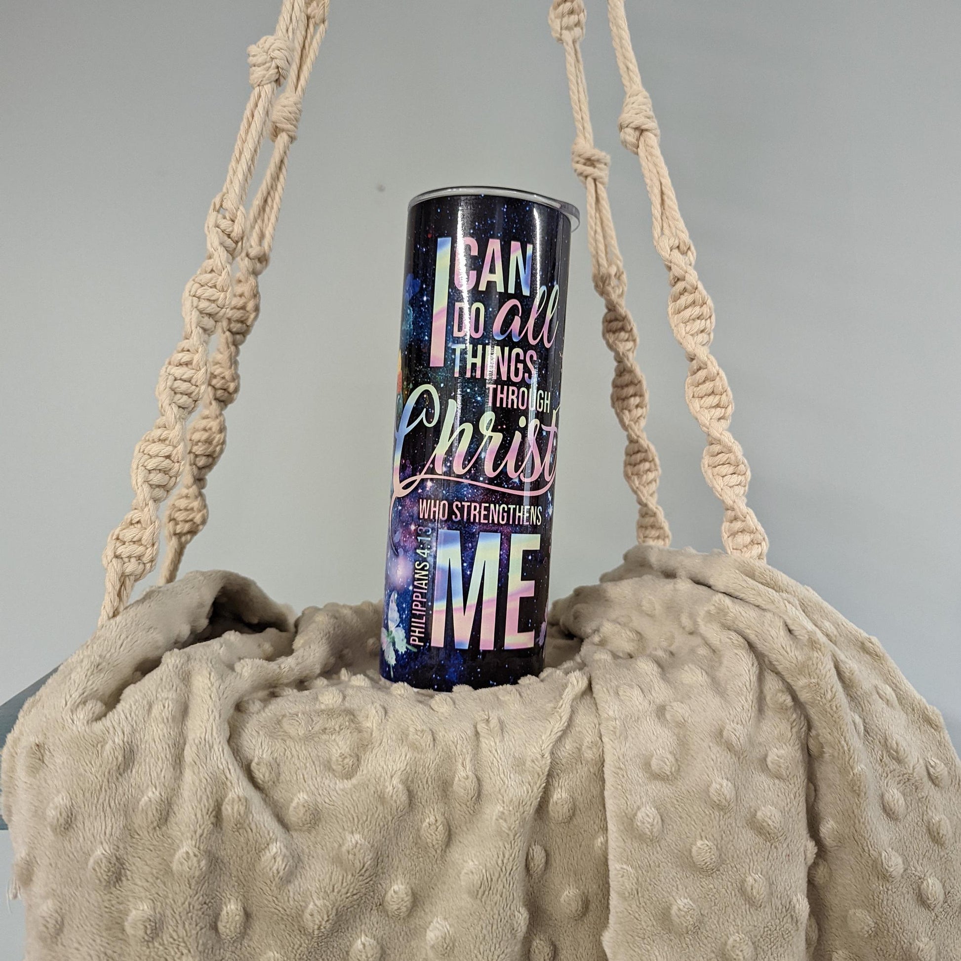 Stay motivated and inspired wherever you go with this beautiful “I Can Do All Things Through Christ” tumbler. Featuring the empowering verse from Philippians 4:13, this tumbler showcases a stunning galaxy background with vibrant pastel lettering — a perfect mix of faith and style.