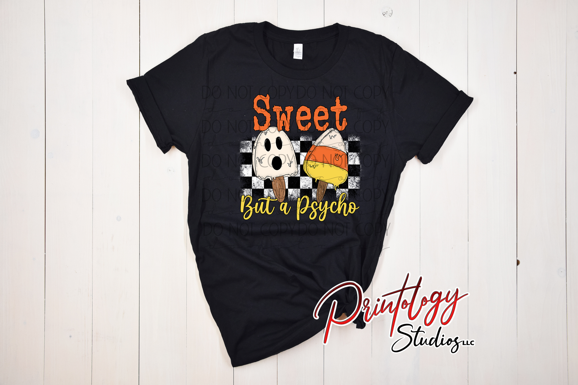 Add a playful edge to your Halloween collection with this “Sweet But a Psycho” DTF Transfer! Featuring a spooky ghost pop and a candy corn ice cream pop over a grunge checkered background, this quirky design is equal parts cute, creepy, and funny. It's the perfect statement piece for those who love Halloween with a twist of humor.