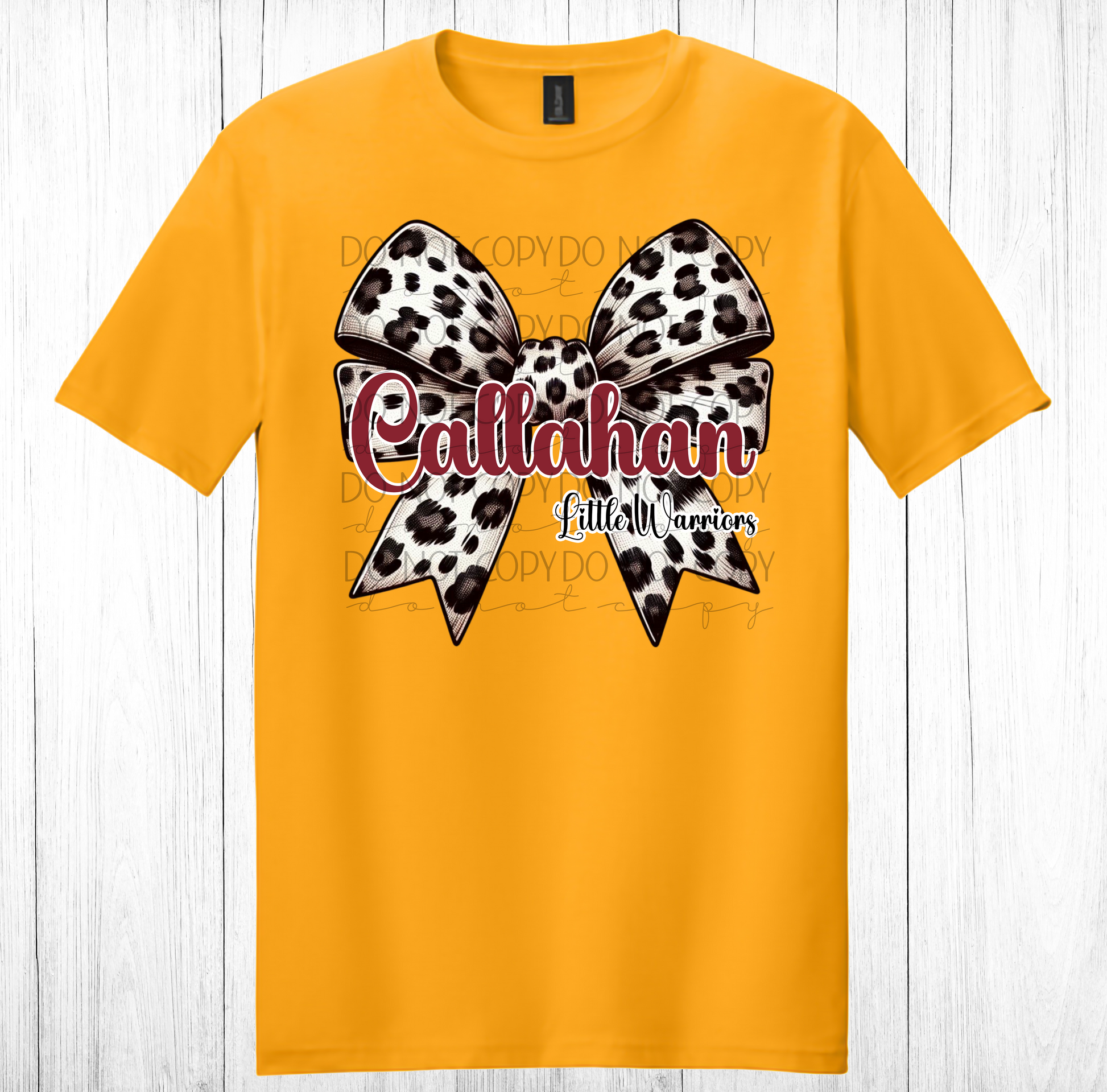 Set on a vibrant gold shirt, this design features a chic leopard-print bow and bold Callahan script in rich cardinal tones — a perfect match for local school colors. Whether you’re cheering from the stands, volunteering, or just showing your hometown pride, this shirt shines with style and spirit.