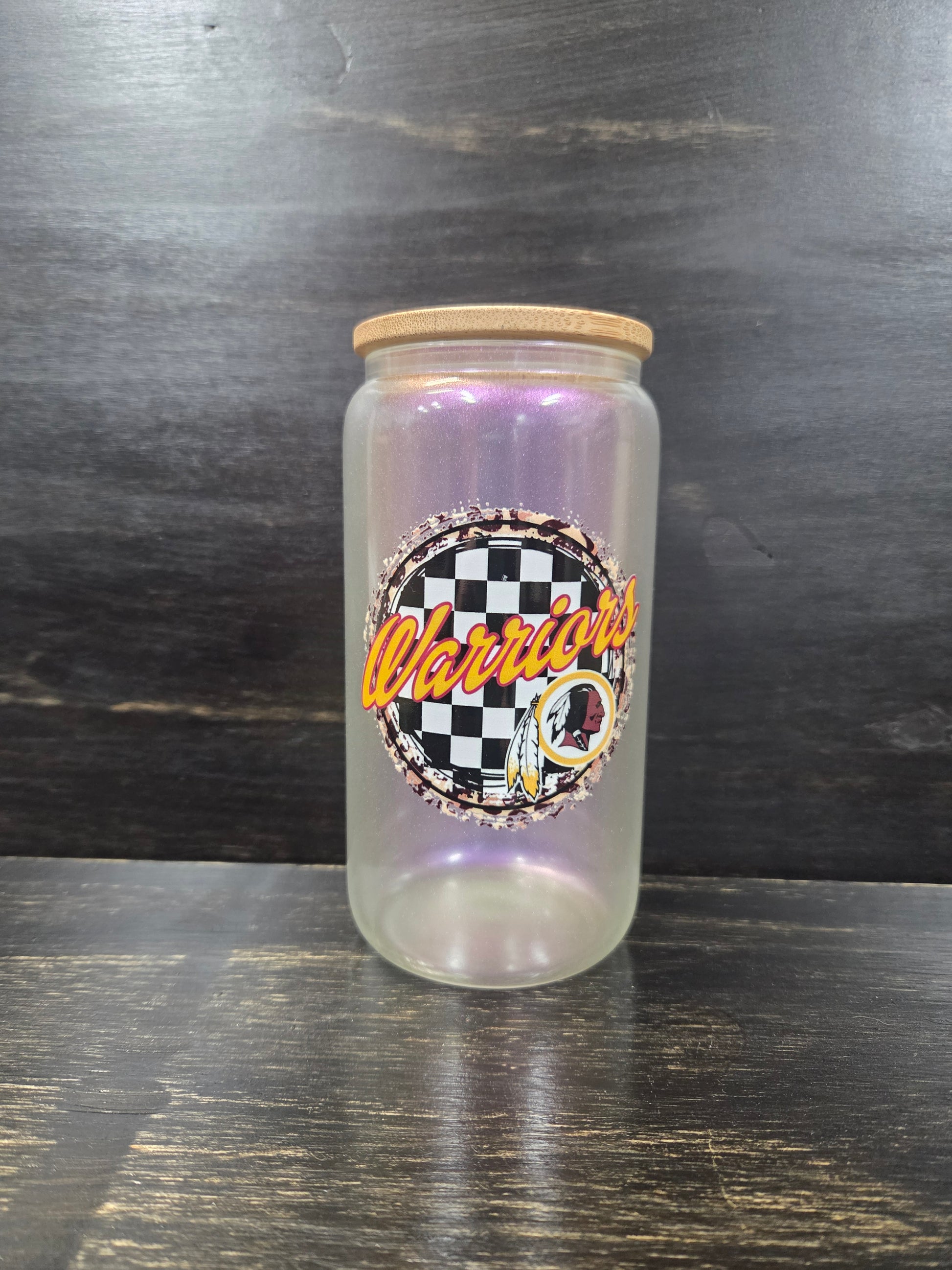Show your Warriors pride with this stylish 16oz frosted glass can, featuring a bold checkered circle emblem and classic Warriors script applied with a permanent UV DTF wrap. The frosted finish paired with the vibrant design makes this cup perfect for everyday drinks, game days, gifts, and school spirit events.