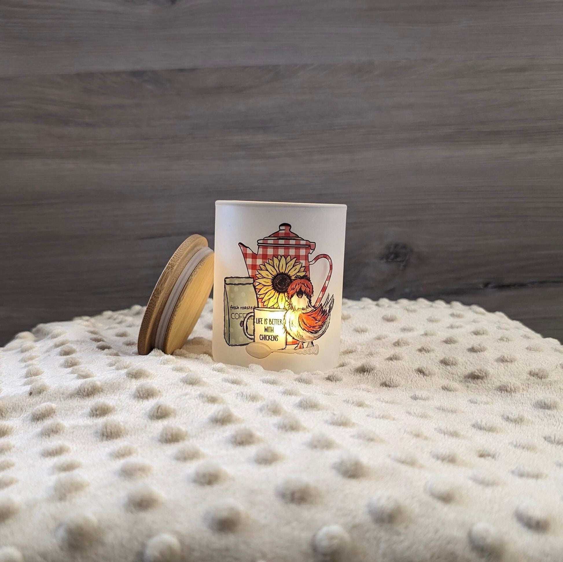 Perfect for kitchens, farmhouse décor, or gifting to the chicken lover in your life! The frosted glass jar gives a soft, warm glow when lit, and the natural wooden lid keeps it stylish and fresh when not in use.