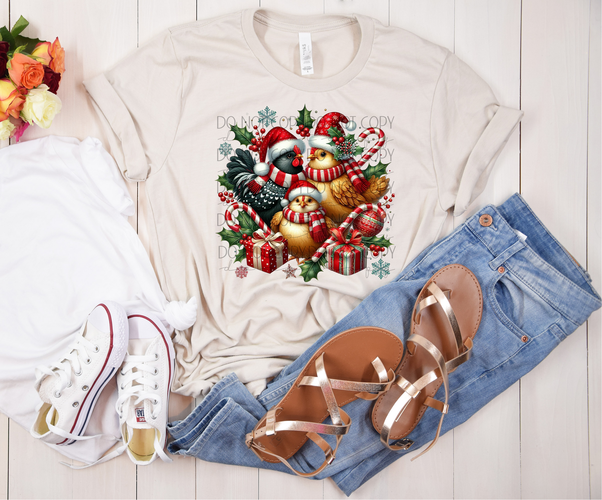 Add some farmhouse charm to your holiday lineup with this Christmas Chickens DTF Transfer! Featuring three adorable chickens dressed in cozy scarves and Santa hats surrounded by holly, candy canes, and presents, this festive design is perfect for poultry lovers and holiday enthusiasts alike!