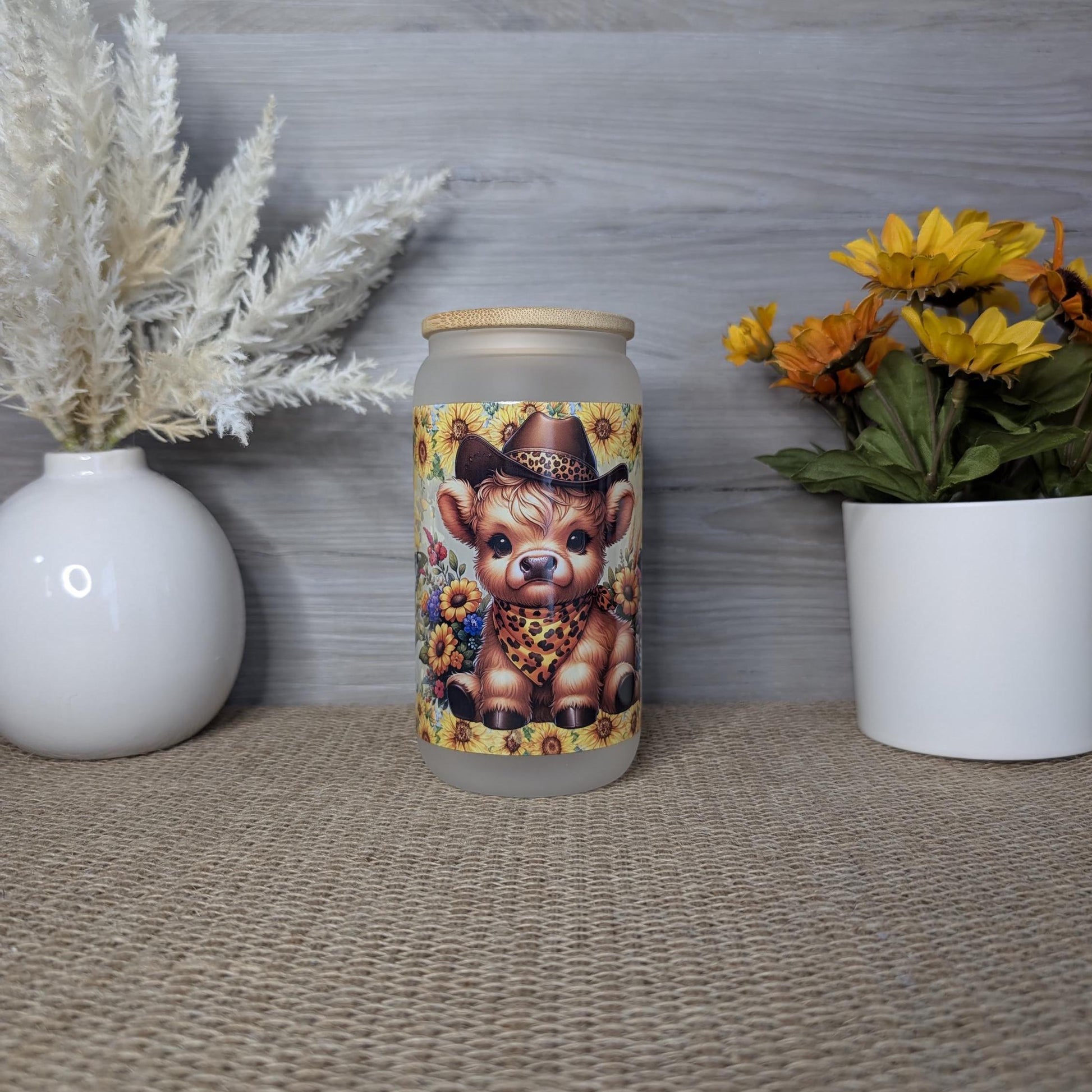 Bring a little western charm to your drinkware with this adorable Cowboy Highland Cow frosted glass can! Featuring a cute baby cow in a cowboy hat and leopard-print bandana surrounded by bright sunflowers, this cup blends rustic flair with playful personality.