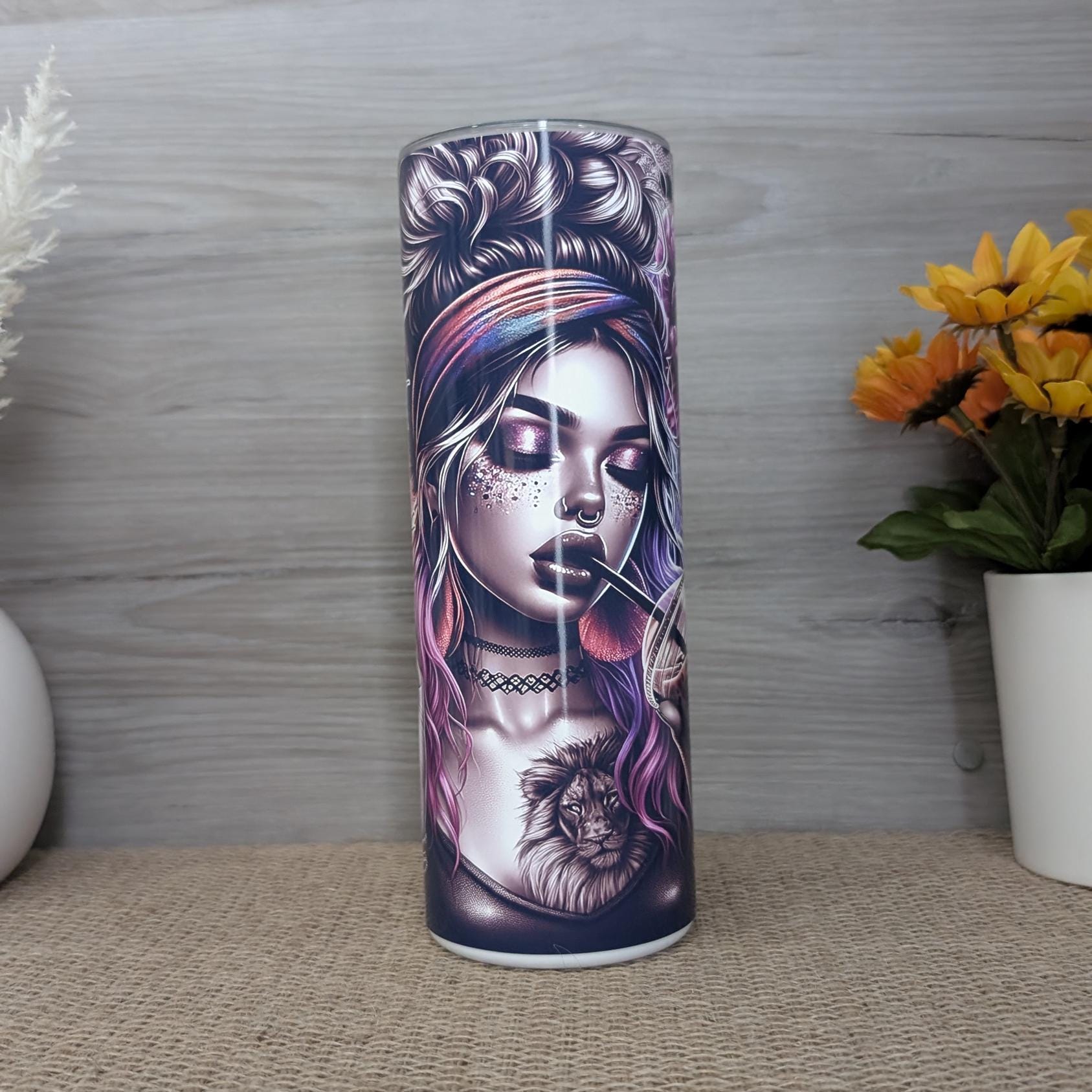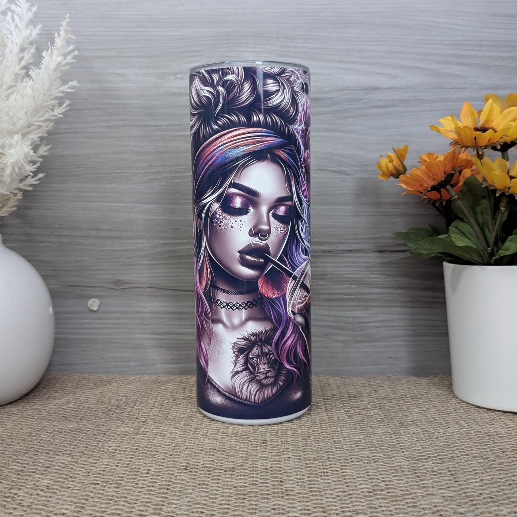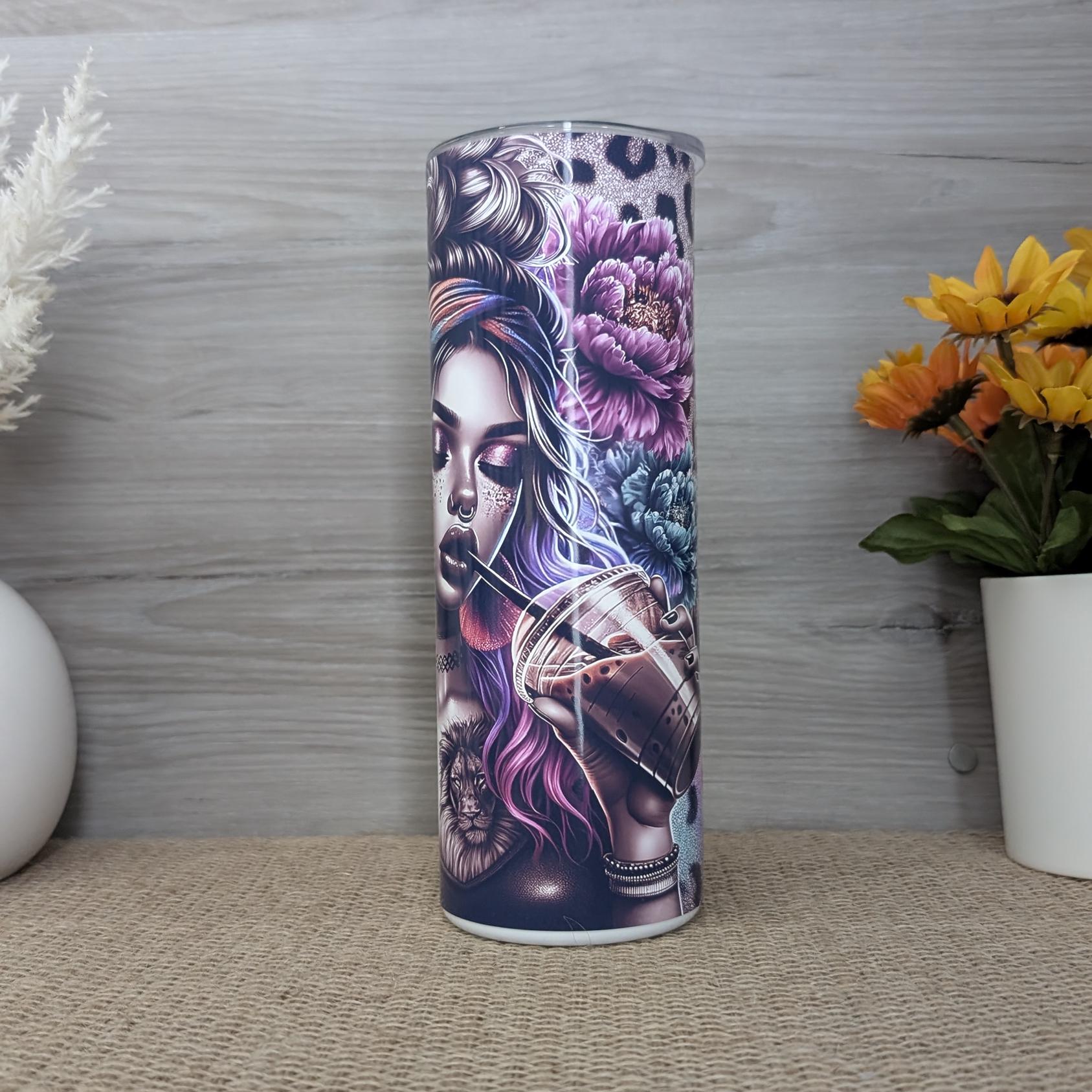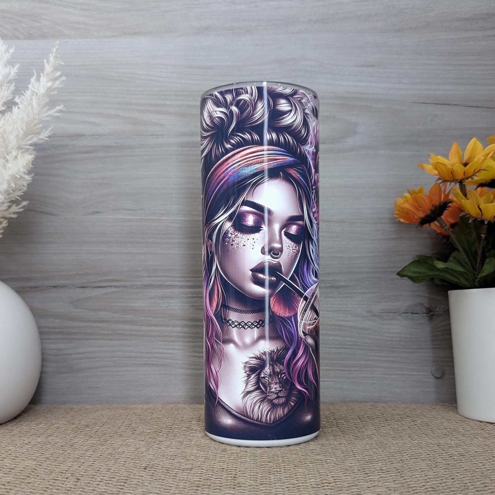 Make a bold statement with this stunning tumbler! Featuring a beautifully detailed design of a fierce, confident woman with shimmering purple hair, smokey eyes, and a majestic lion at her side, this tumbler perfectly blends gothic glam with wild elegance.