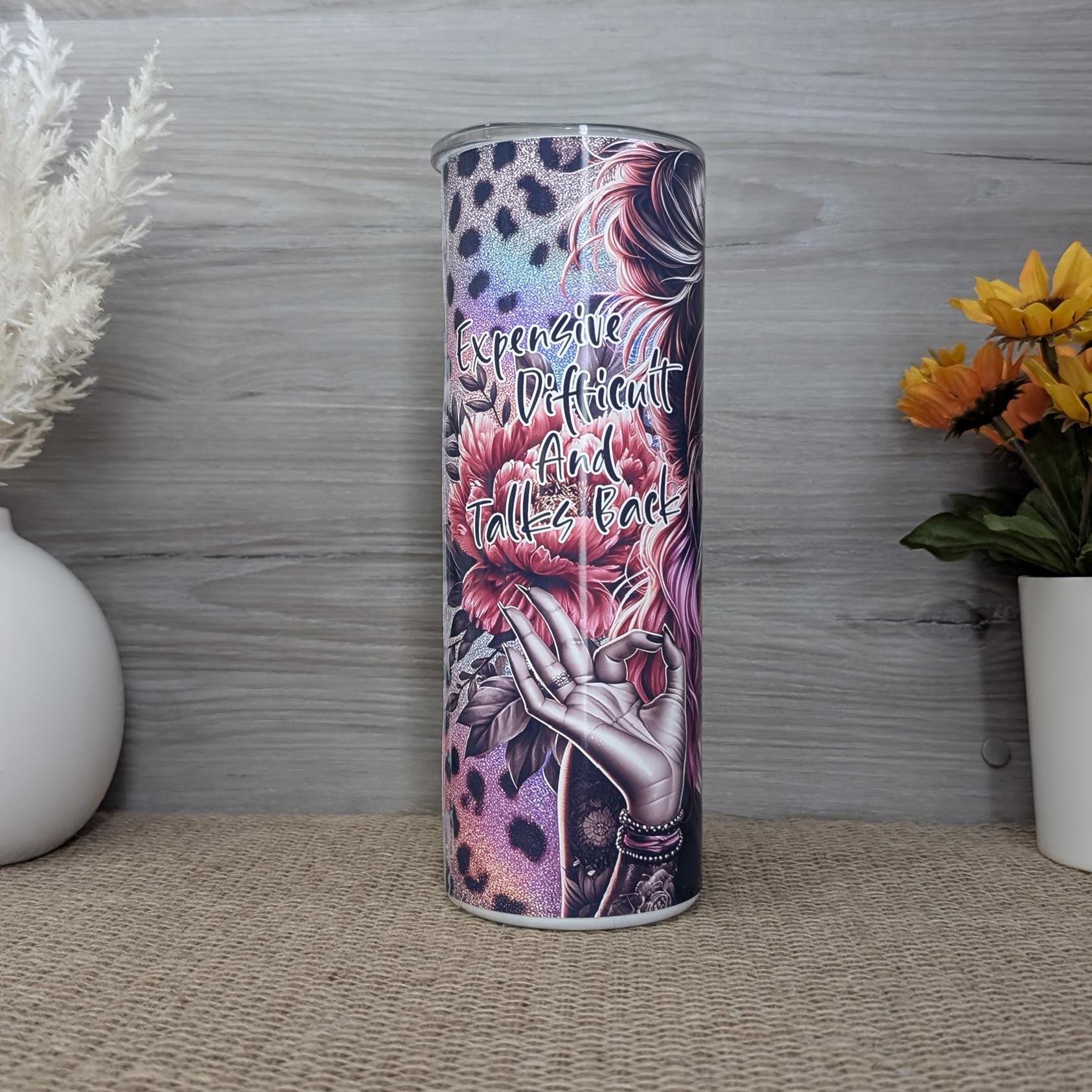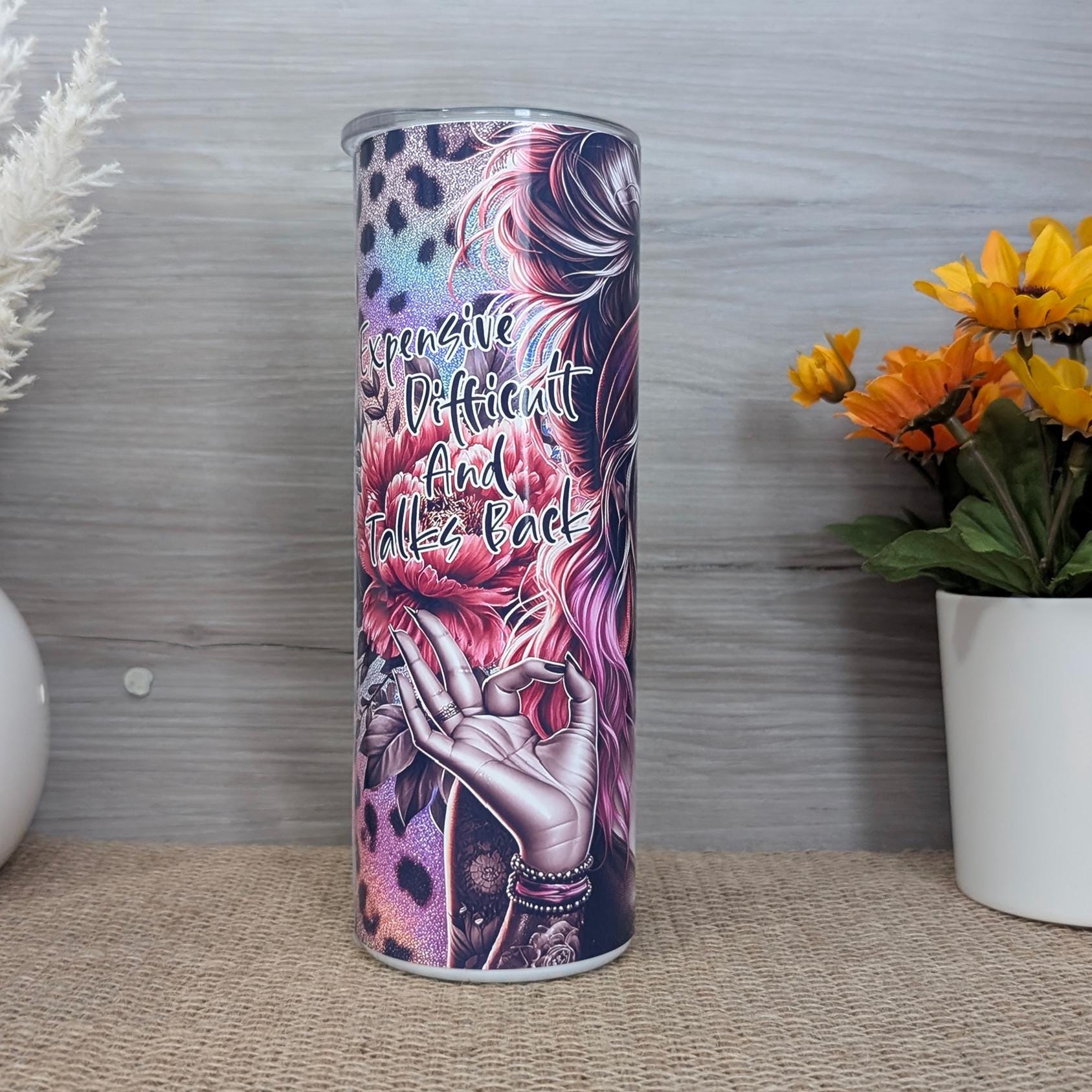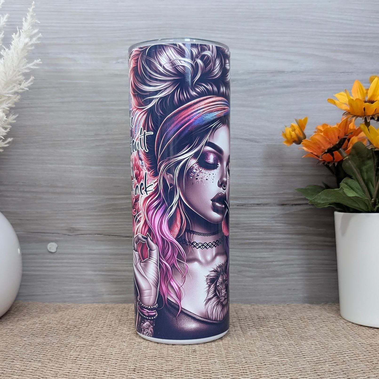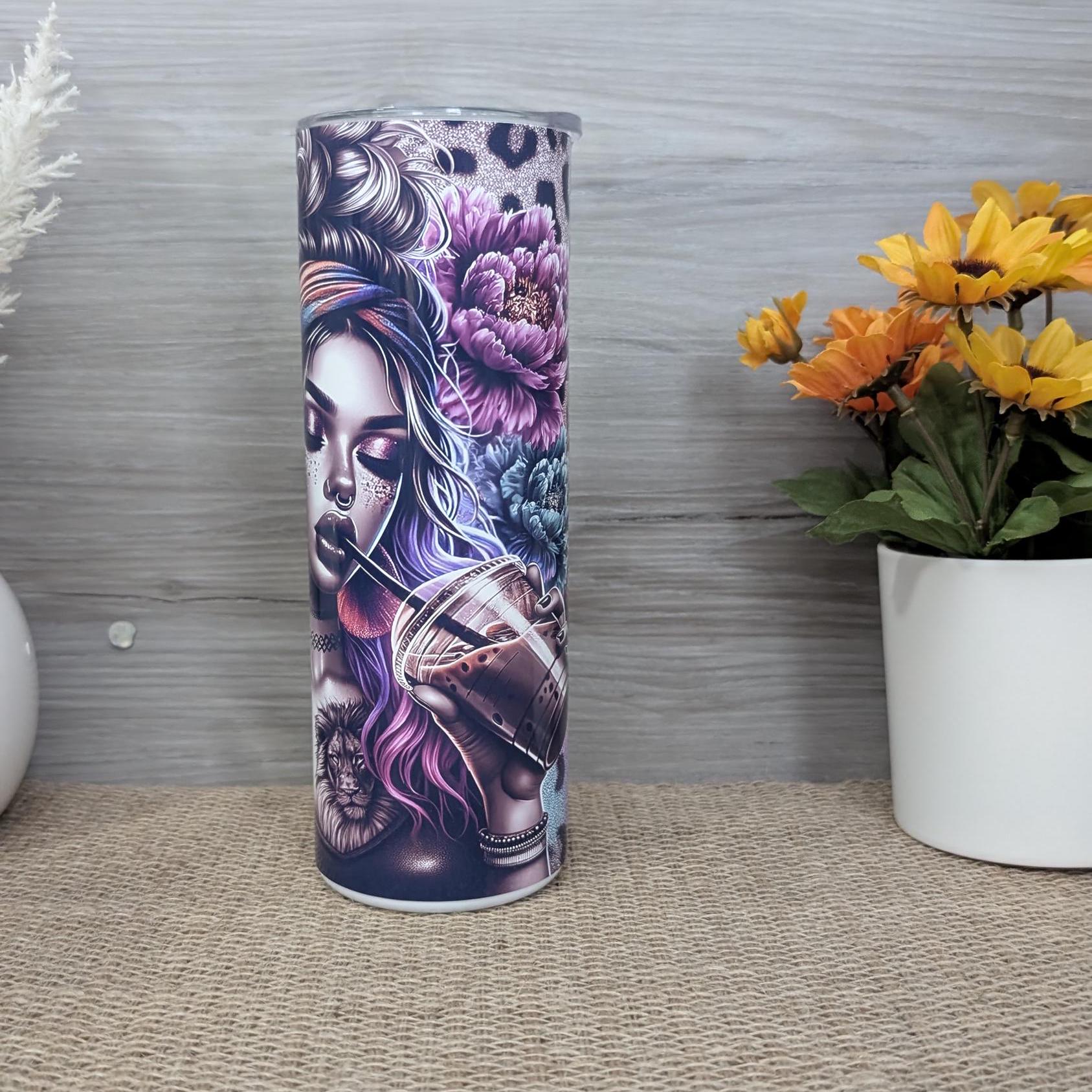 Make a bold statement with this stunning tumbler! Featuring a beautifully detailed design of a fierce, confident woman with shimmering purple hair, smokey eyes, and a majestic lion at her side, this tumbler perfectly blends gothic glam with wild elegance.