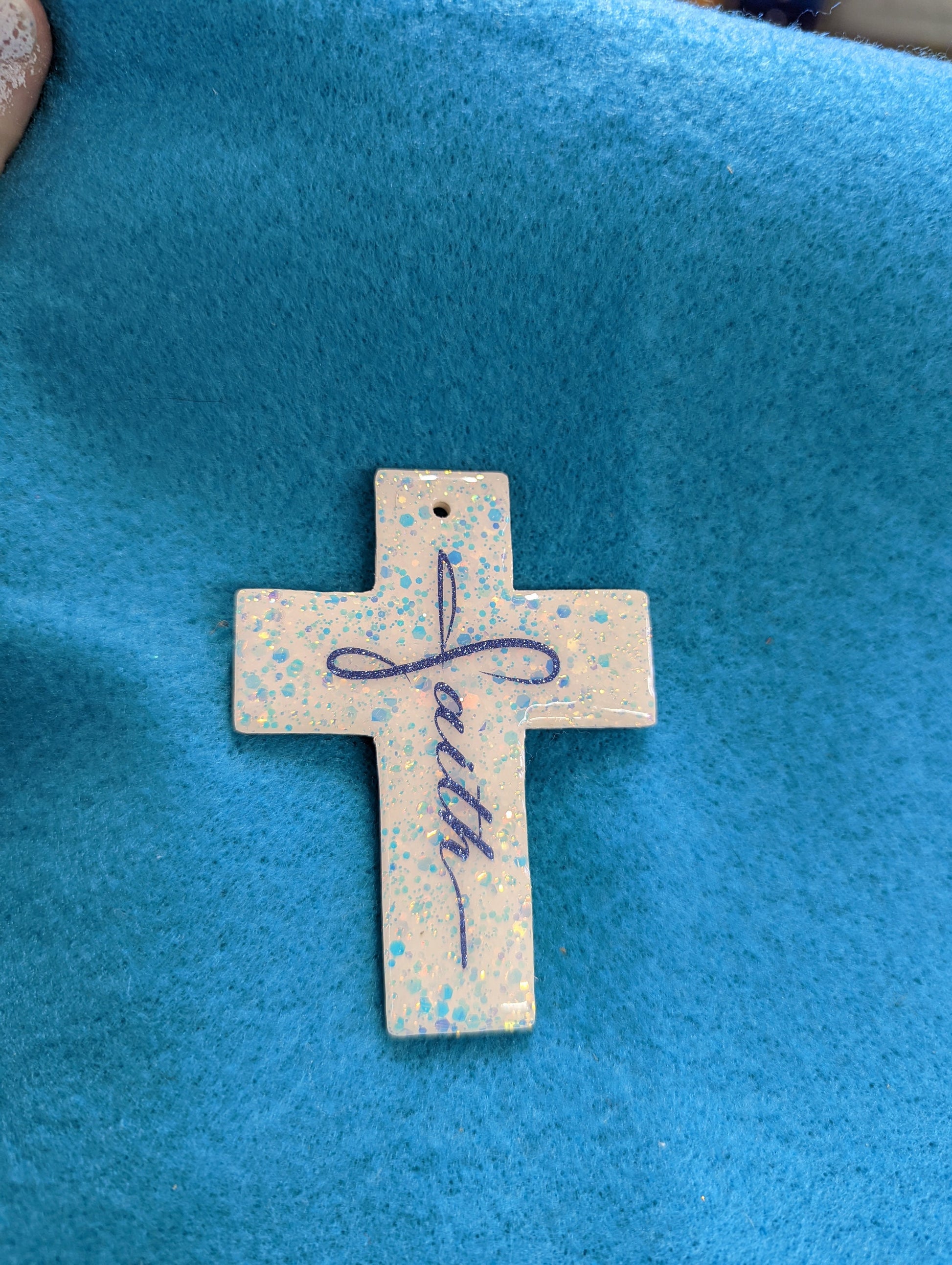 Add a touch of inspiration and sparkle to your tree or home décor with this beautiful “Faith” Cross Ornament. Each piece is handcrafted with care and finished with a glossy, glittered resin coat that catches the light beautifully.