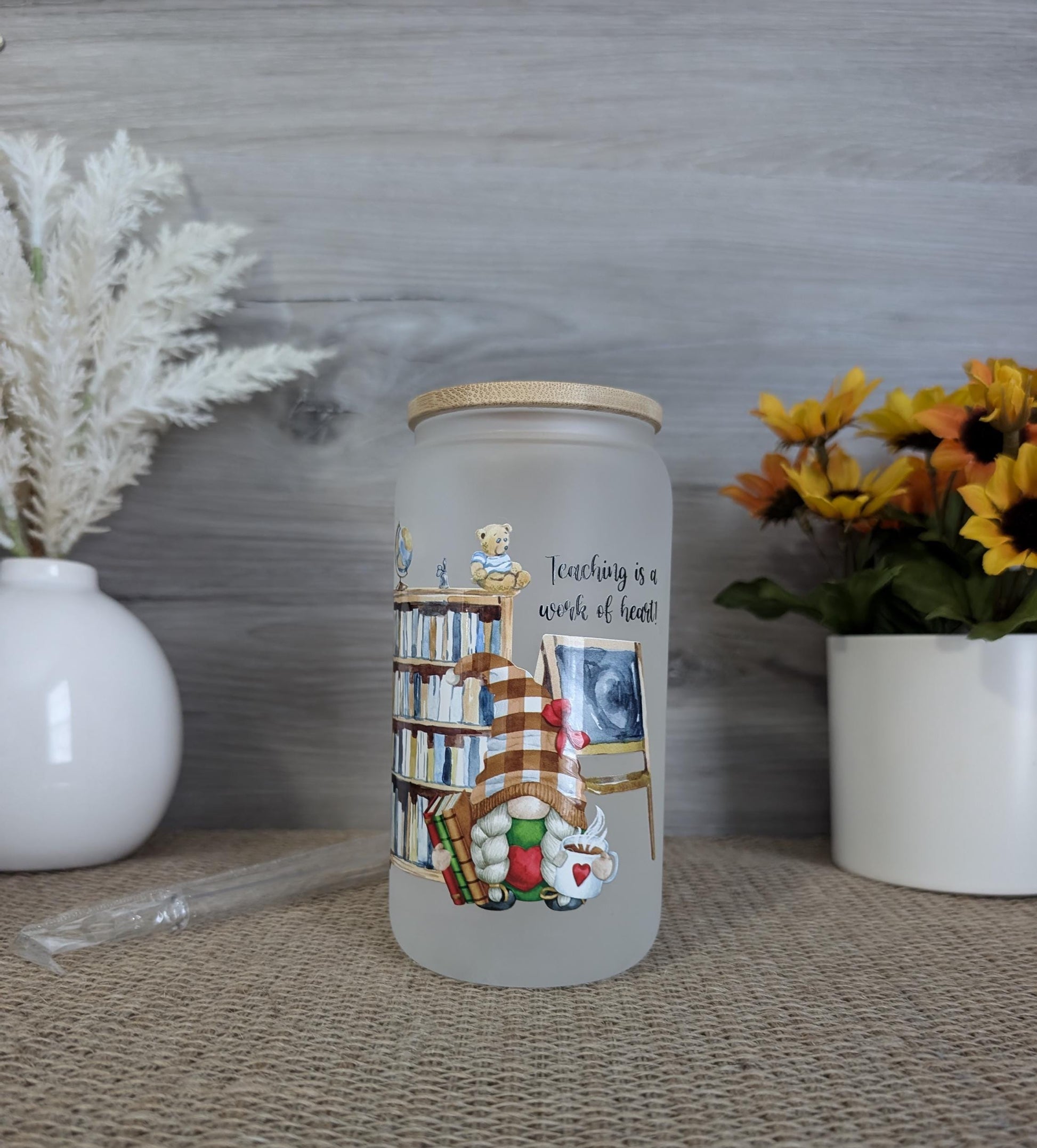 Celebrate the heart and dedication of every teacher with this beautifully designed frosted glass can! Featuring a cozy classroom-inspired illustration—complete with bookshelves, a teddy bear, a globe, stacked books, a warm beverage, and the sweet phrase “Teaching is a work of heart”—this glass makes the perfect gift for teachers, aides, and educators of all kinds.