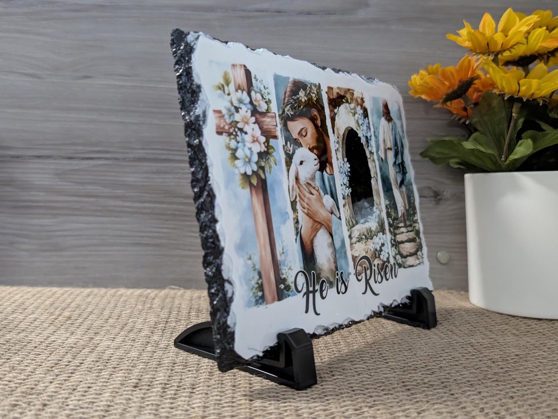 Celebrate the hope and promise of Easter with this stunning “He Is Risen” resurrection slate sign. Featuring a powerful four-panel design that tells the Easter story—from the cross, to Christ the Shepherd, the empty tomb, and Jesus walking away in victory—this piece beautifully reflects the true meaning of the resurrection.