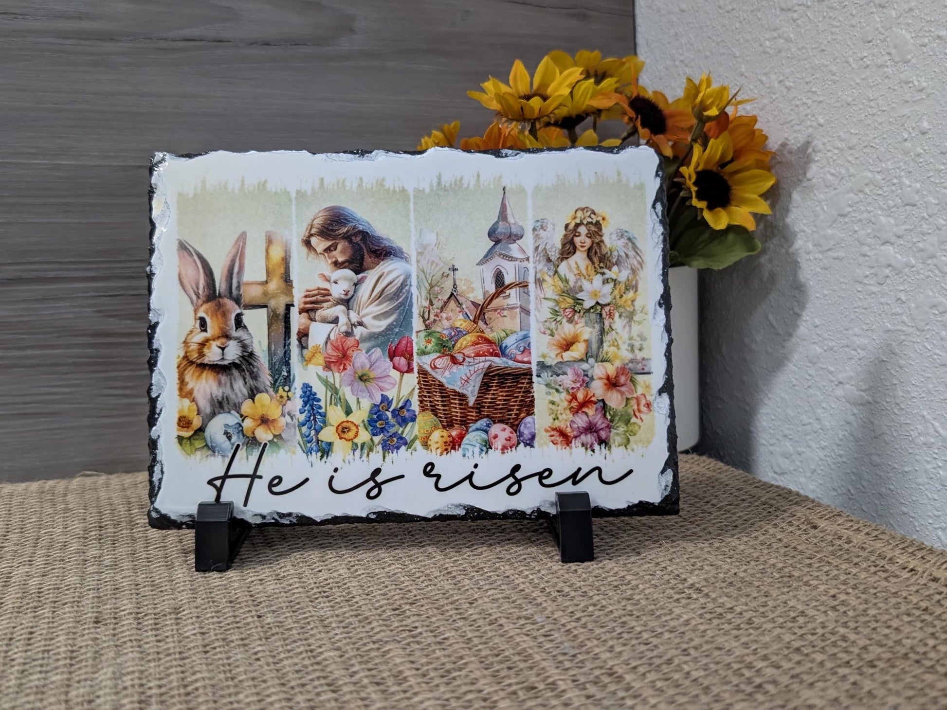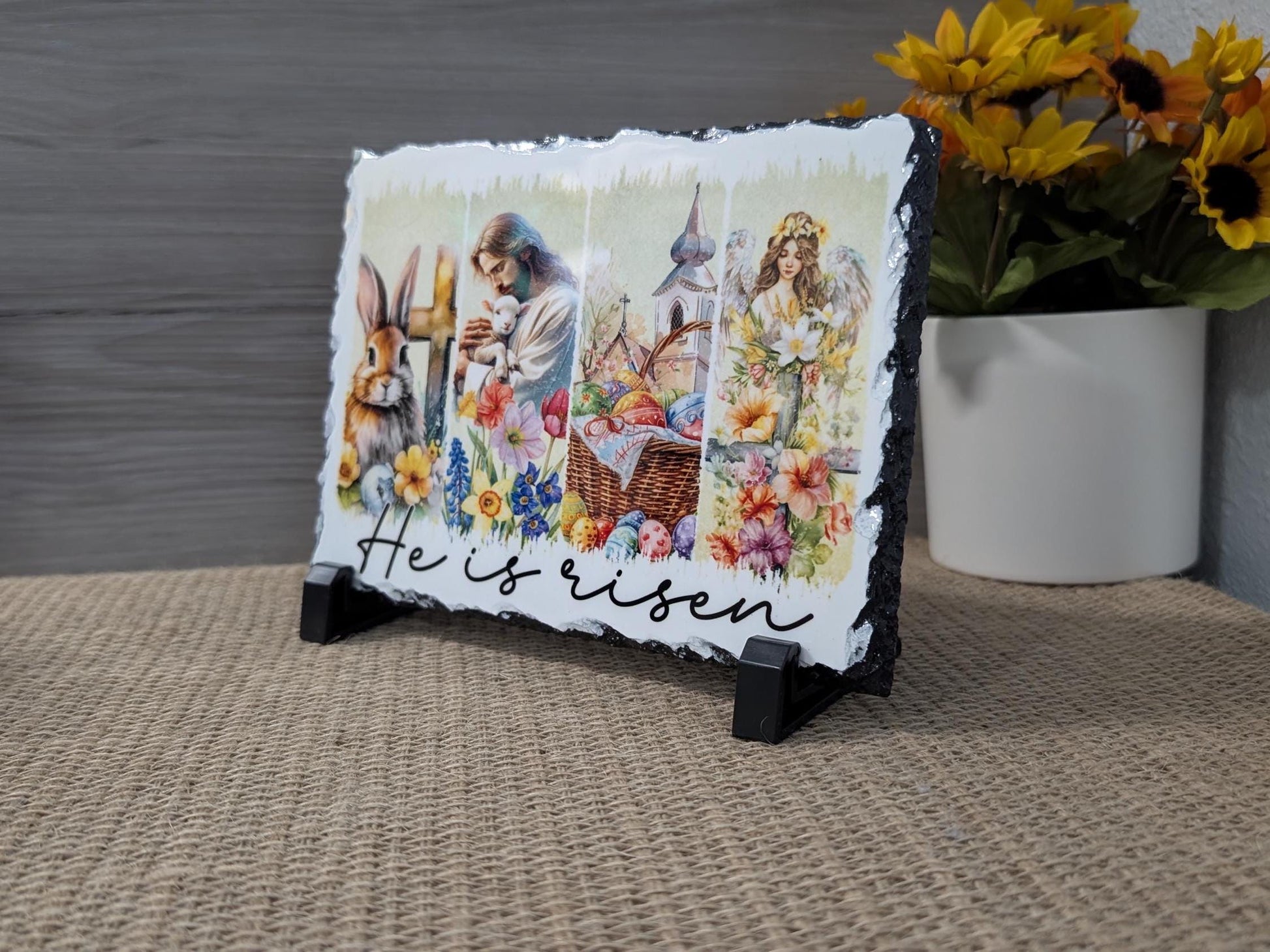 Celebrate the true meaning of Easter with this beautiful “He Is Risen” slate sign, featuring a soft, faith-inspired design with meaningful Easter imagery including the cross, Jesus, angel, flowers, and symbols of new life.