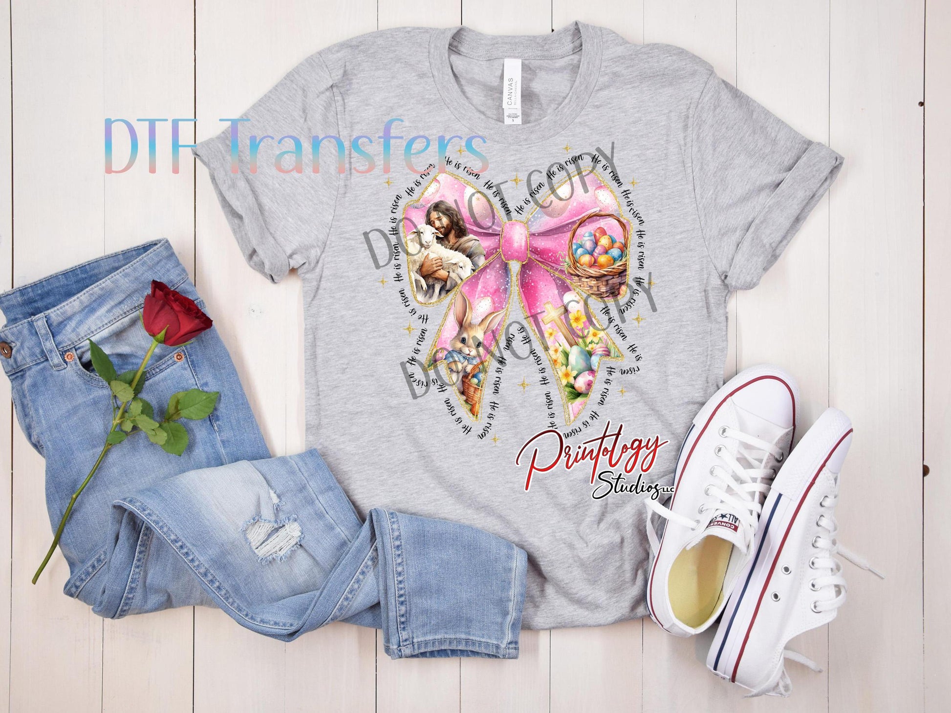 Create beautiful, faith-inspired apparel with this He Is Risen Easter Bow DTF Transfer. This design features a soft pink bow surrounded by meaningful Christian imagery, including Jesus with a lamb, Easter eggs, florals, and a bunny, with the phrase “He Is Risen” repeating around the design. It’s perfect for Easter shirts, church events, spring boutiques, and faith-based apparel.