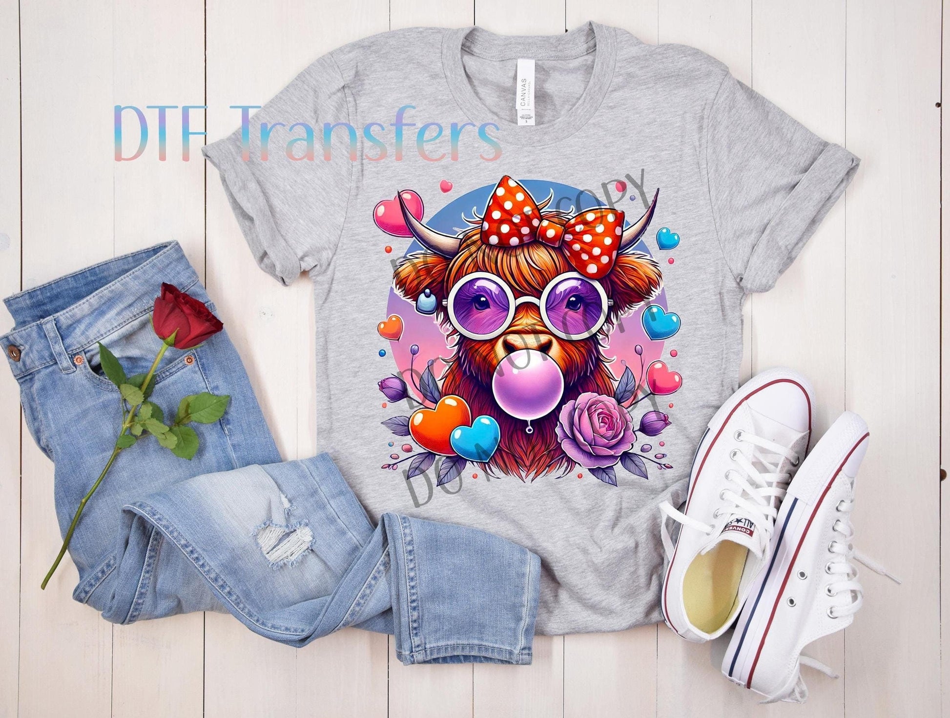 Add a pop of playful charm to your apparel with this Valentine Bubblegum Cow DTF Transfer! Featuring an adorable highland cow blowing bubblegum, wearing oversized glasses, a polka dot bow, and surrounded by colorful hearts and roses, this design is perfect for Valentine's Day, boutique fashion, or just spreading some love all year long.