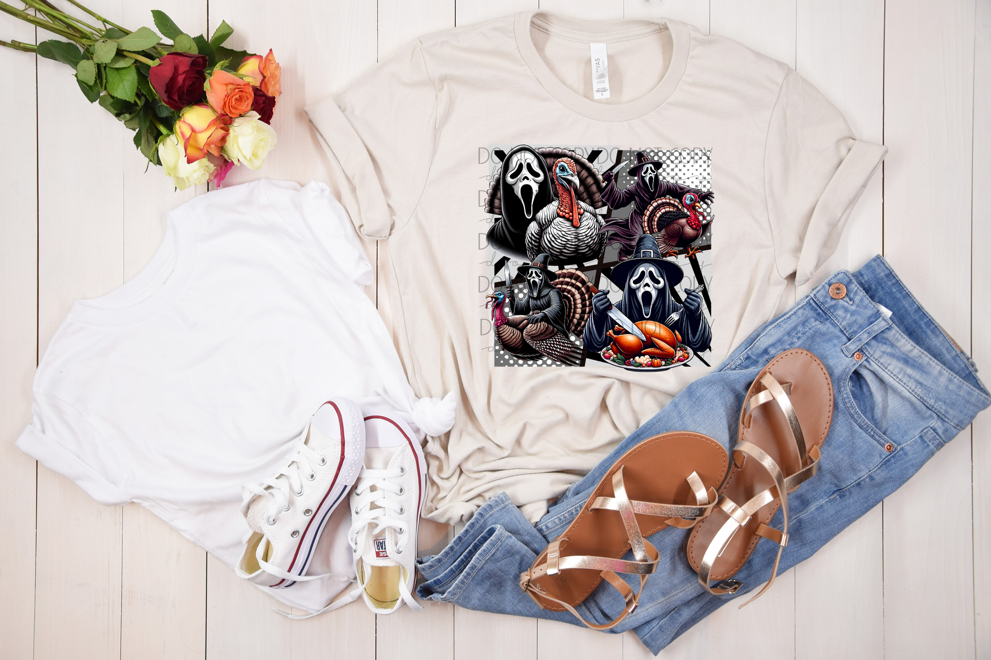 Get spooky this turkey season with our Ghostface Thanksgiving DTF Transfer! This fun mashup of horror and holiday cheer features Ghostface with his Thanksgiving feast — complete with turkeys, pumpkins, and a little dark humor. Perfect for those who love Halloween vibes all year long!