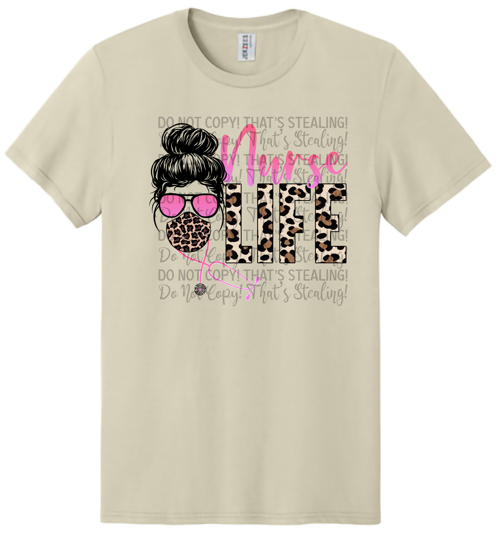 Rock your shift in style with this trendy "Nurse Life" shirt! Featuring a fierce messy bun, leopard print face mask, pink shades, and bold leopard-patterned "LIFE" lettering, this design is perfect for nurses who slay every day. The hot pink “Nurse” script and stethoscope detail add a fun, feminine touch — making it a favorite for any healthcare hero with flair.