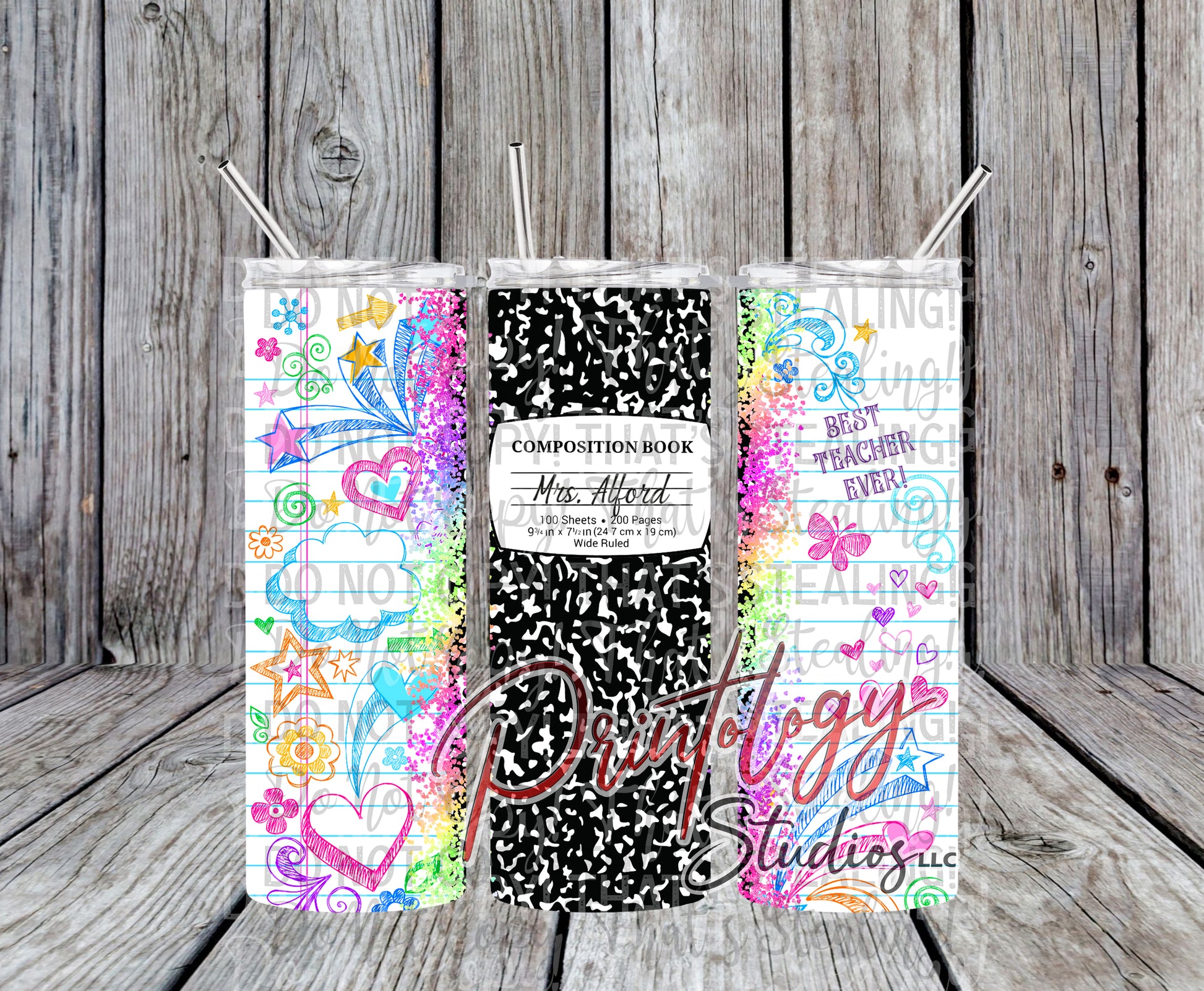 Start the school year in style with this vibrant 20oz Composition Book & Doodle Tumbler! Featuring a fun trio of designs—classic black-and-white composition notebook, rainbow notebook doodles, and colorful lined paper art—this tumbler is perfect for teachers, students, and school supply lovers!