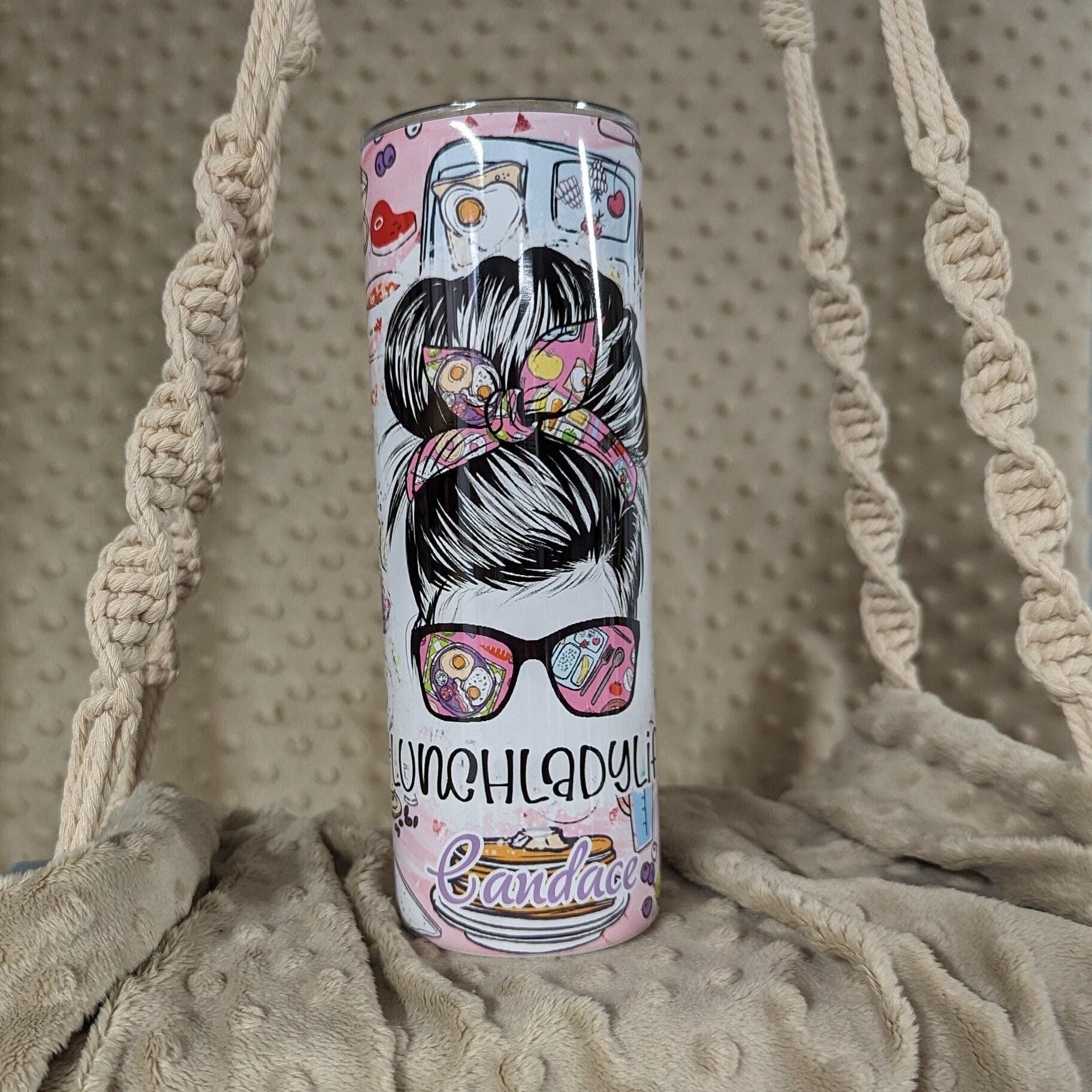 Celebrate the hardworking lunch lady in your life with this fun and sassy "Lunch Lady Life" tumbler! Featuring a trendy messy bun design with breakfast foods, coffee, and kitchen essentials reflected in her sunglasses, this tumbler perfectly captures the spirit of the cafeteria queen. Customized with the name "Candace" (or your choice of name), it's the perfect personalized gift for any proud lunch lady!