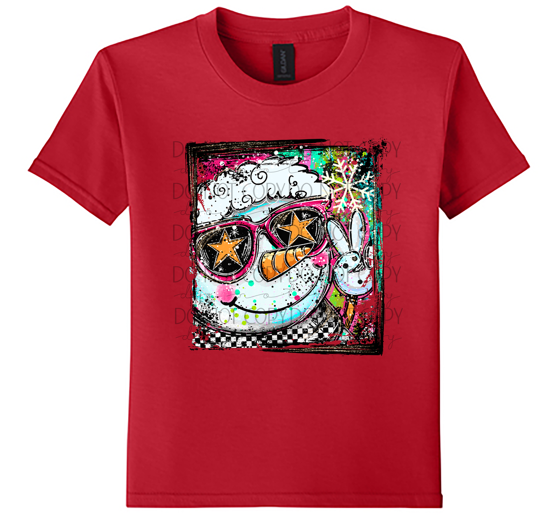 Bring the chill vibes this holiday season with this playful snowman tee! Featuring a cheerful snowman rocking bold star-shaped sunglasses, a classic carrot nose, and flashing a peace sign, this design mixes festive cheer with trendy style. Bright neon accents and snowflake details.