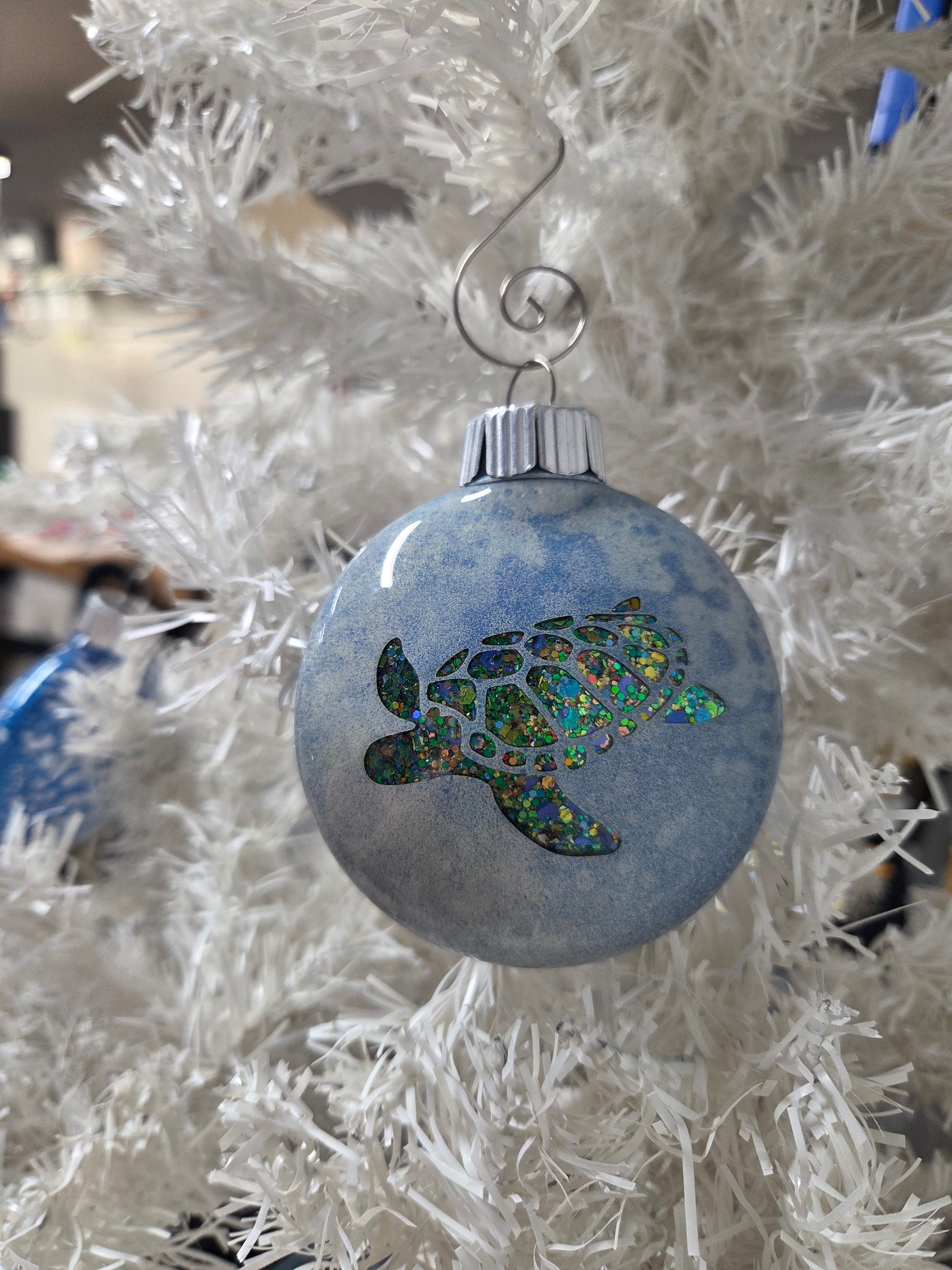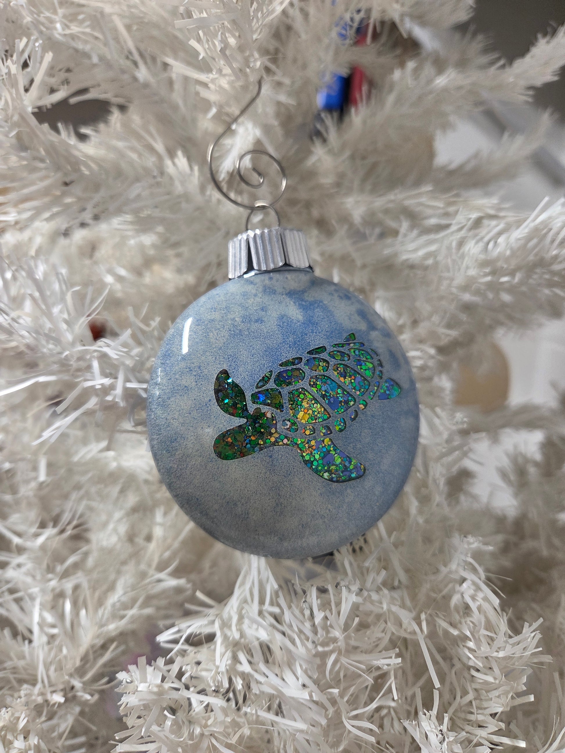 Bring a touch of coastal charm to your Christmas tree with this beautiful Handmade Sea Turtle Ornament! Each ornament is lovingly crafted with a shimmering ocean blue swirl base and a holographic glitter sea turtle that sparkles like sunlight on the water.