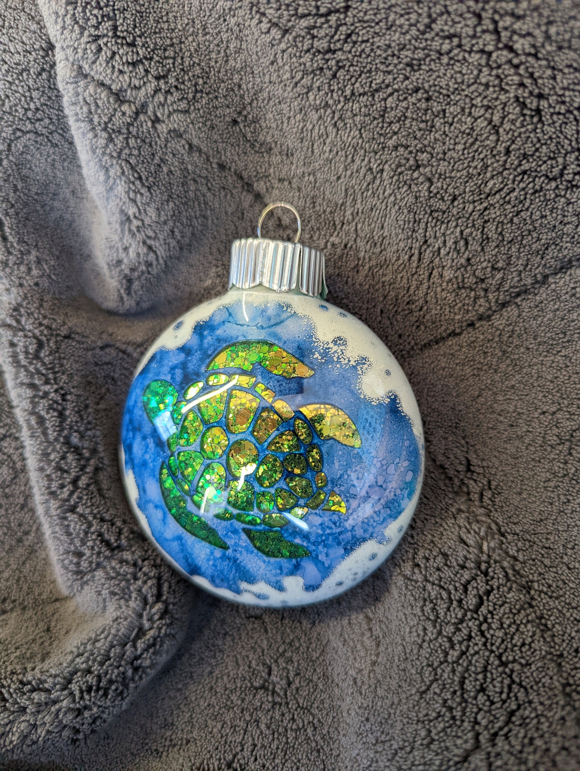 Bring a splash of the ocean to your holiday décor with this stunning Handmade Sea Turtle Ornament! Featuring a vibrant, shimmering sea turtle design set against a beautiful ocean-blue background, this piece captures the spirit of the coast and the beauty of marine life.
