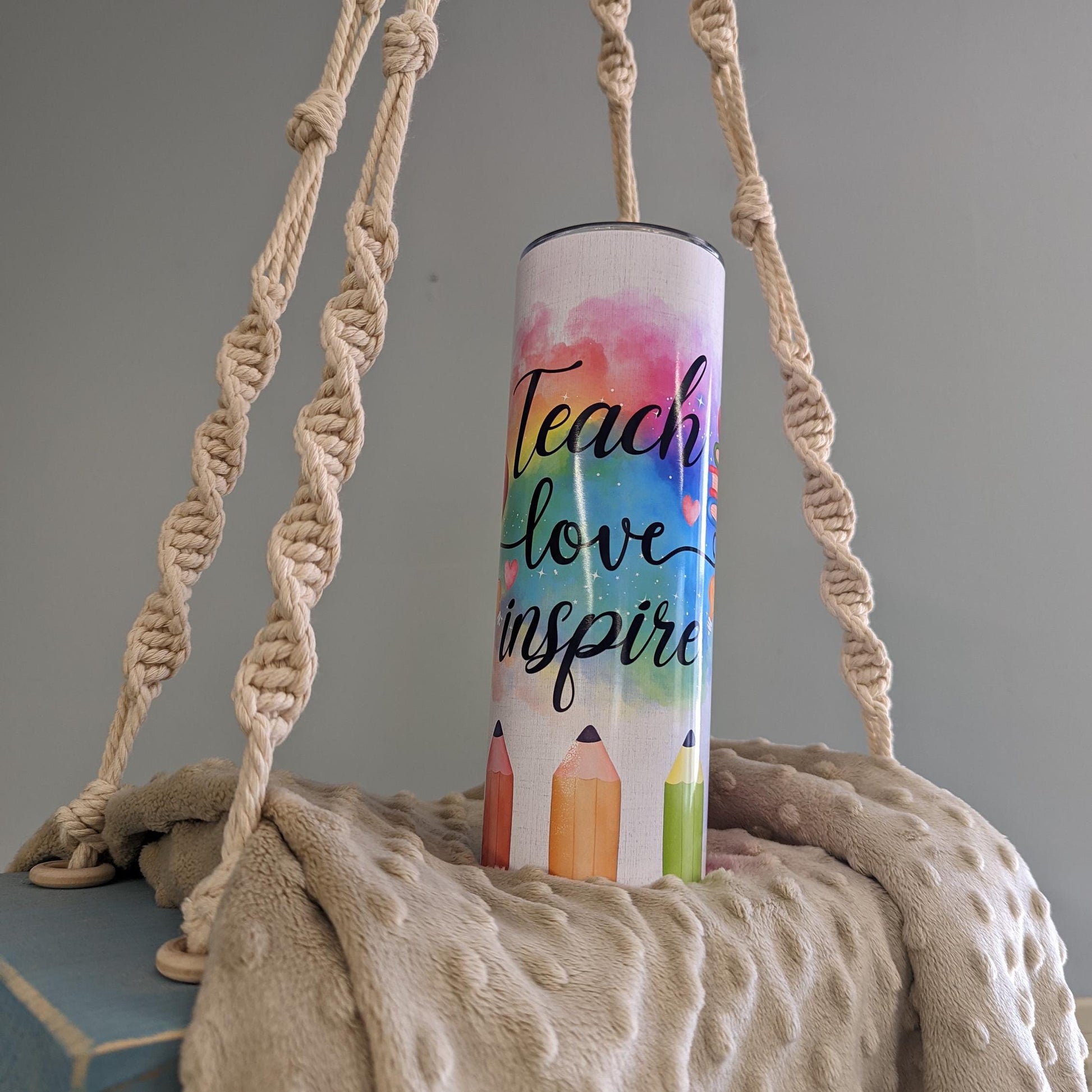 Brighten any school day with this beautiful Teach • Love • Inspire 20oz skinny tumbler! Designed with a soft watercolor rainbow background, whimsical classroom doodles, and bold inspirational lettering, this tumbler makes the perfect daily companion for passionate educators.