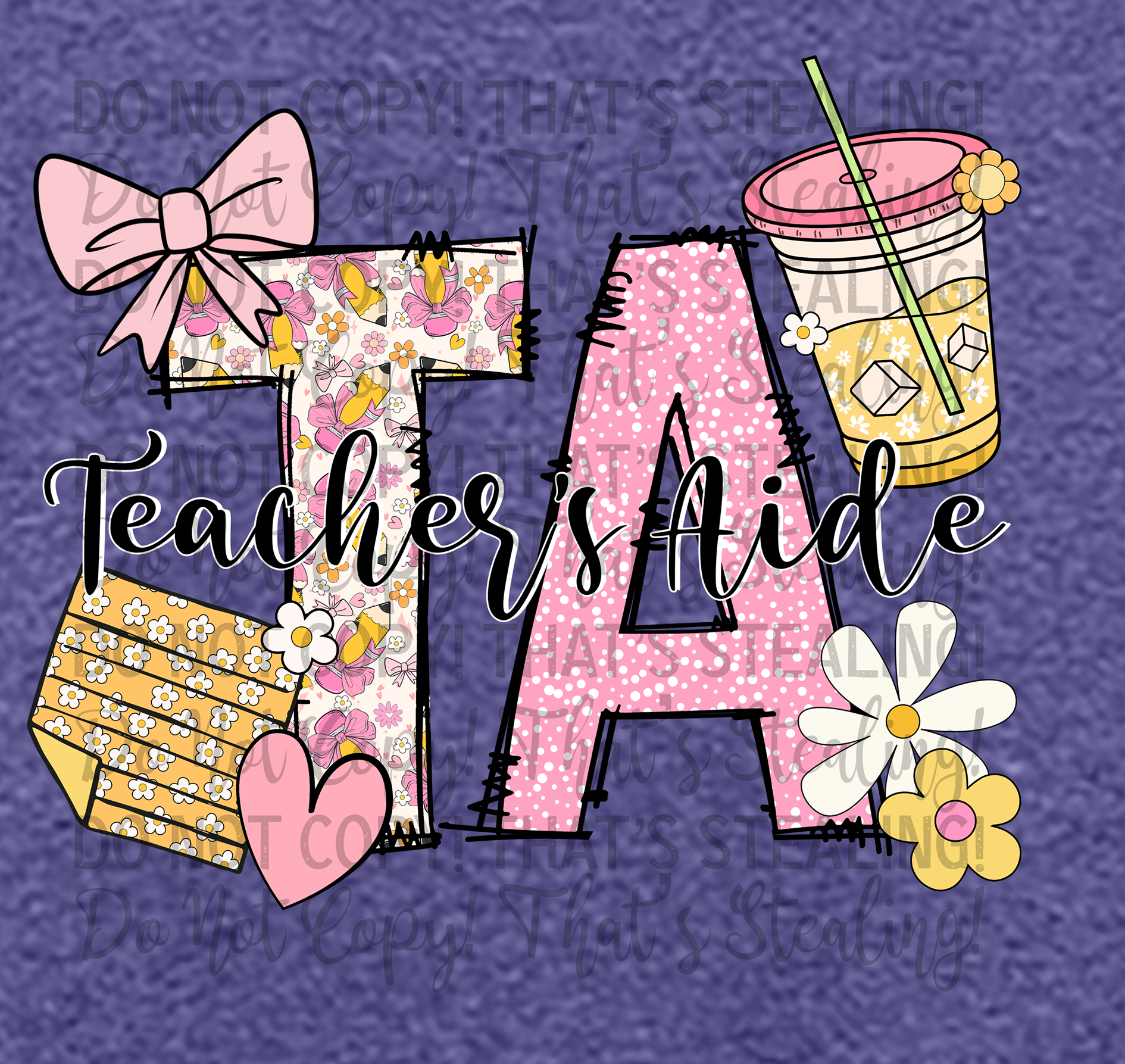 Celebrate the heart of the classroom with this adorable “Teacher’s Aide” graphic tee. A floral “T”, pink polka-dot “A”, daisies, iced coffee, pencil, puzzle-heart, and a cute bow come together on a heather-berry shirt for the ultimate helper vibe.