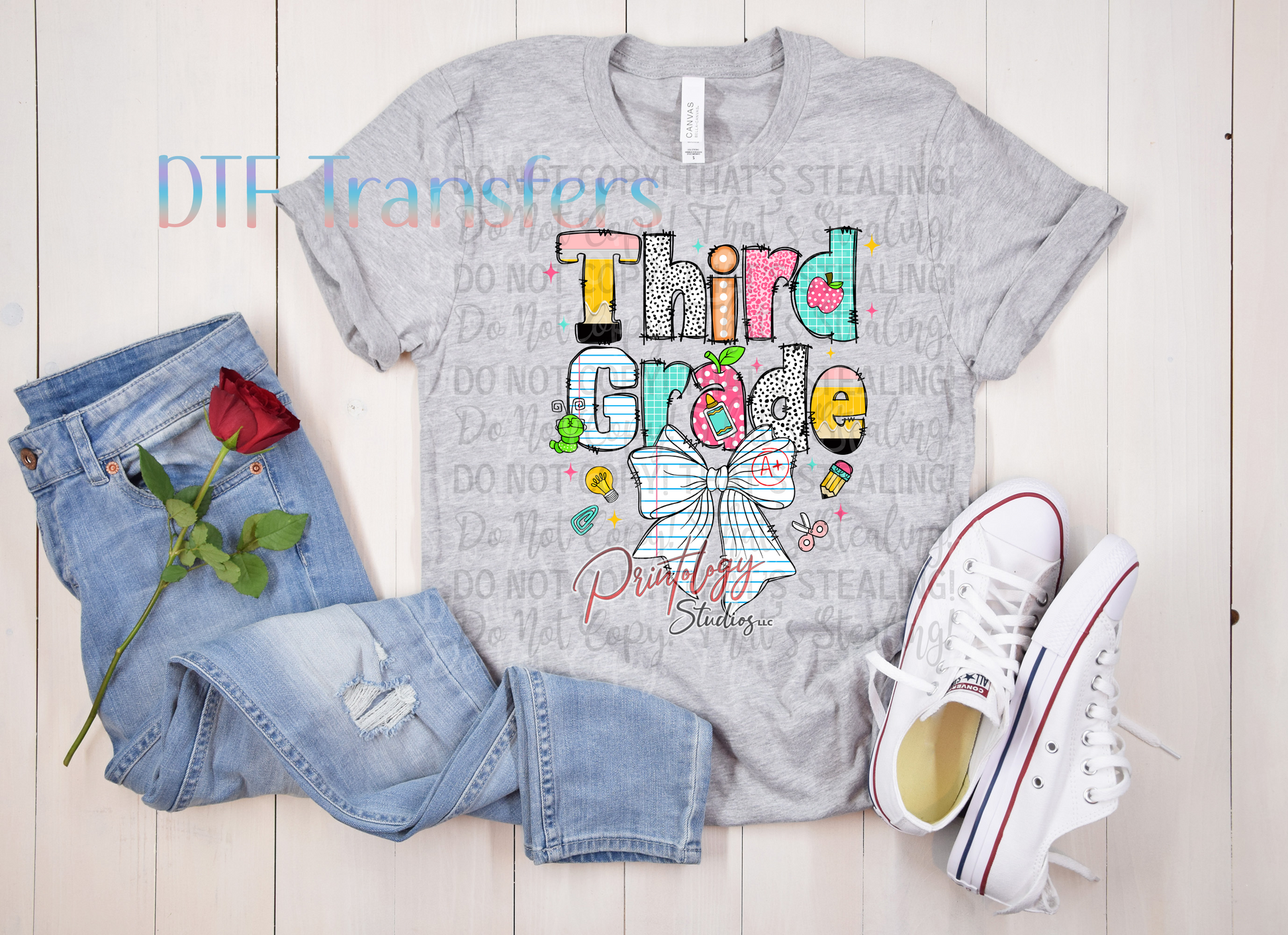 Get your classroom-ready look with this vibrant "Third Grade" Coquette Bow DTF Transfer! Perfect for teachers, moms, or proud supporters of their favorite third grader, this playful and colorful design features fun patterned letters, school-themed doodles (like a pencil, apple, lightbulb, and more), and a large gingham bow with an “A+” touch of charm.