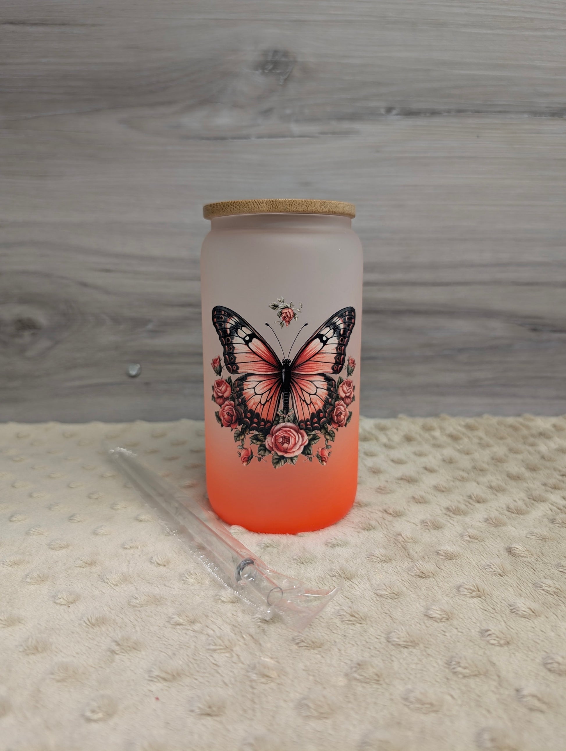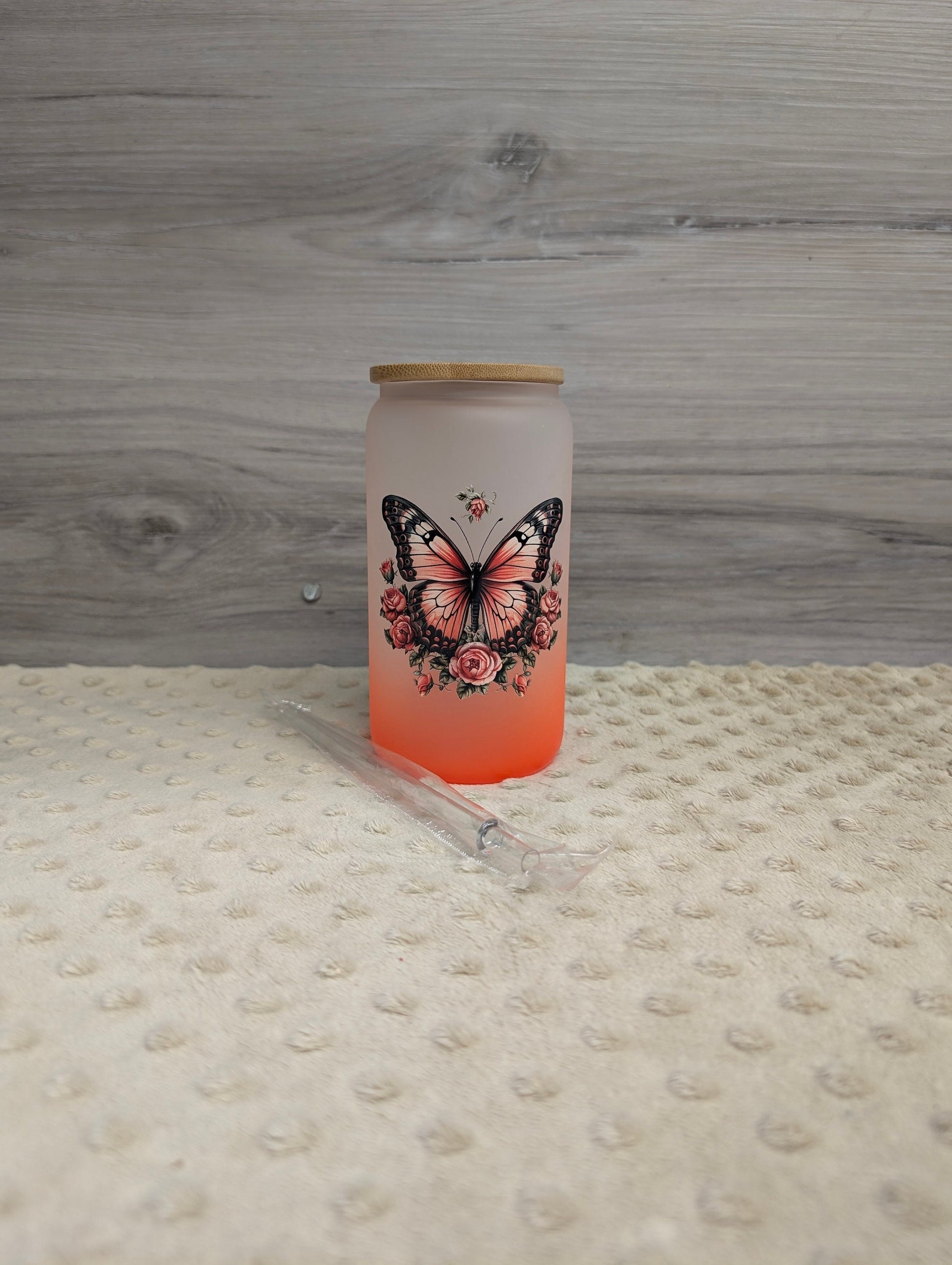 Sip in style with this stunning Butterfly 16oz frosted glass can! Featuring a beautifully detailed butterfly surrounded by delicate roses on a soft pink-to-clear frosted finish, this cup adds a graceful and feminine touch to any drink.