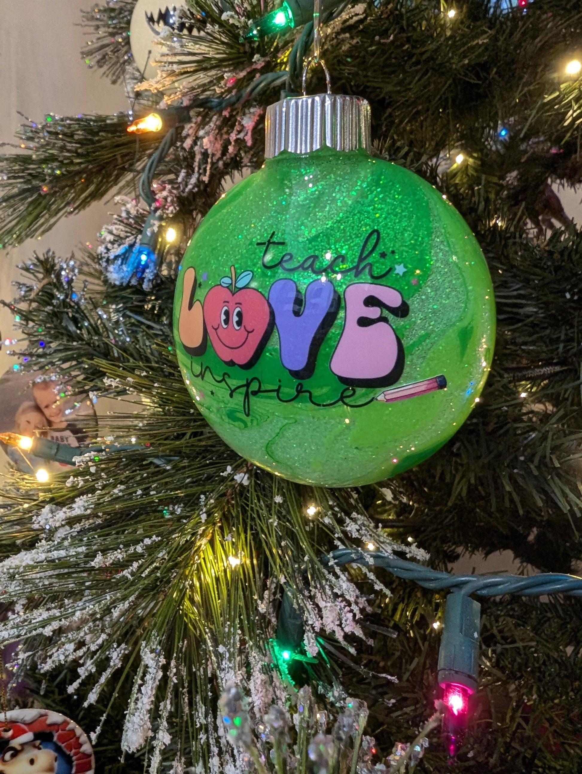 Each ornament is one-of-a-kind, crafted with a glossy swirl finish and sealed for lasting shine. Whether it’s for a classroom tree, a thoughtful holiday gift, or teacher appreciation week, this ornament adds a joyful pop of color and meaning anywhere it hangs.