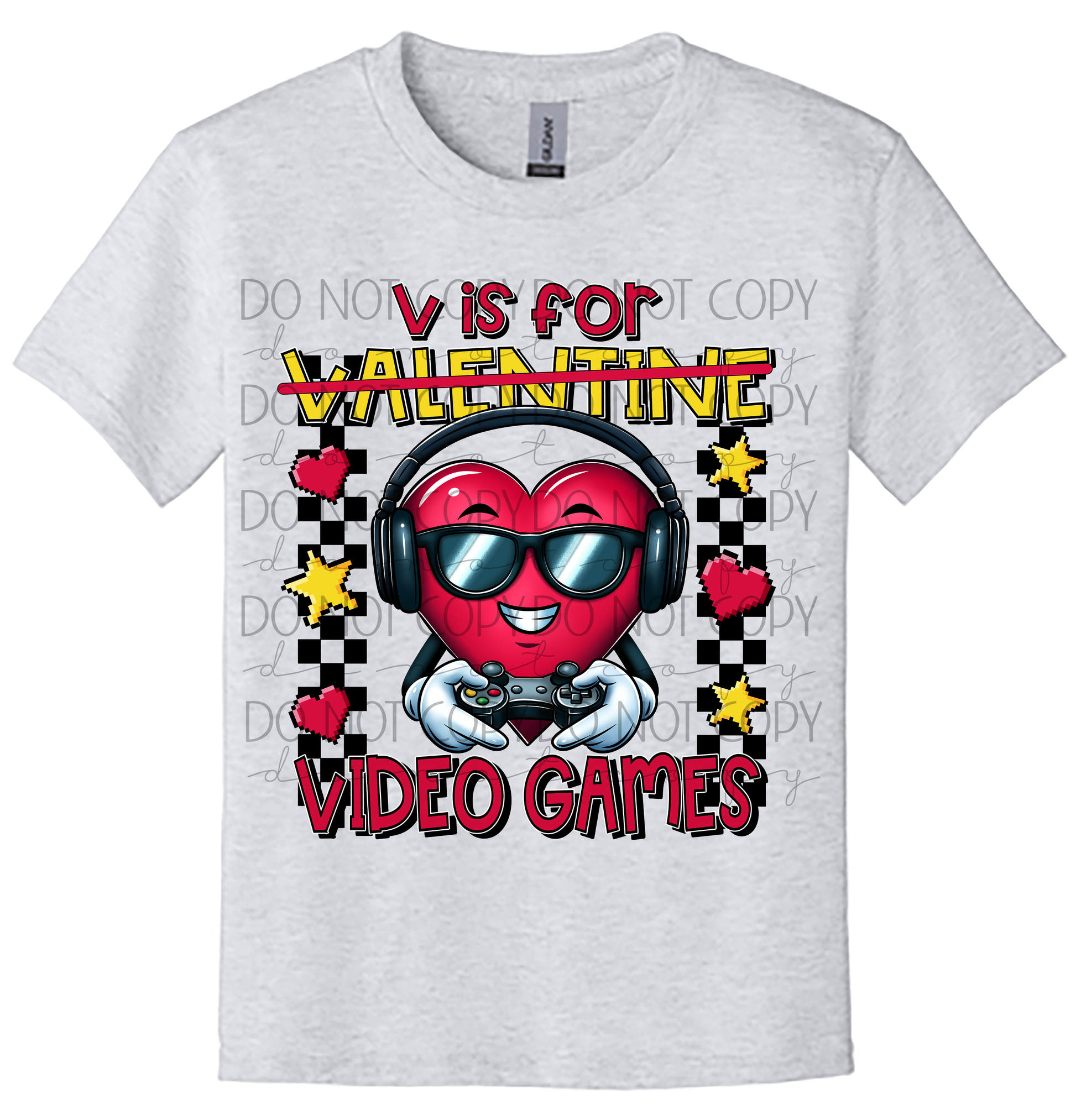 Forget Valentine—V is for Video Games! This playful design features a cool heart character wearing headphones and sunglasses while gaming, making it the perfect Valentine shirt for kids and gamers who would rather play than pass out cards.