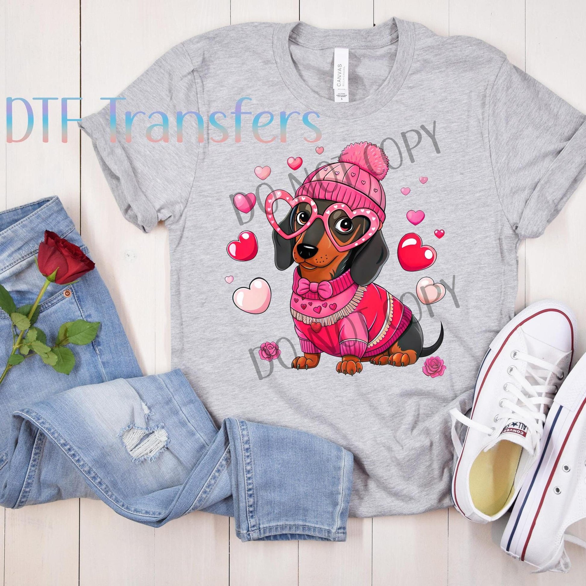 Valentine Dachshund DTF Transfer | Cute Dog in Pink Sweater & Heart Glasses