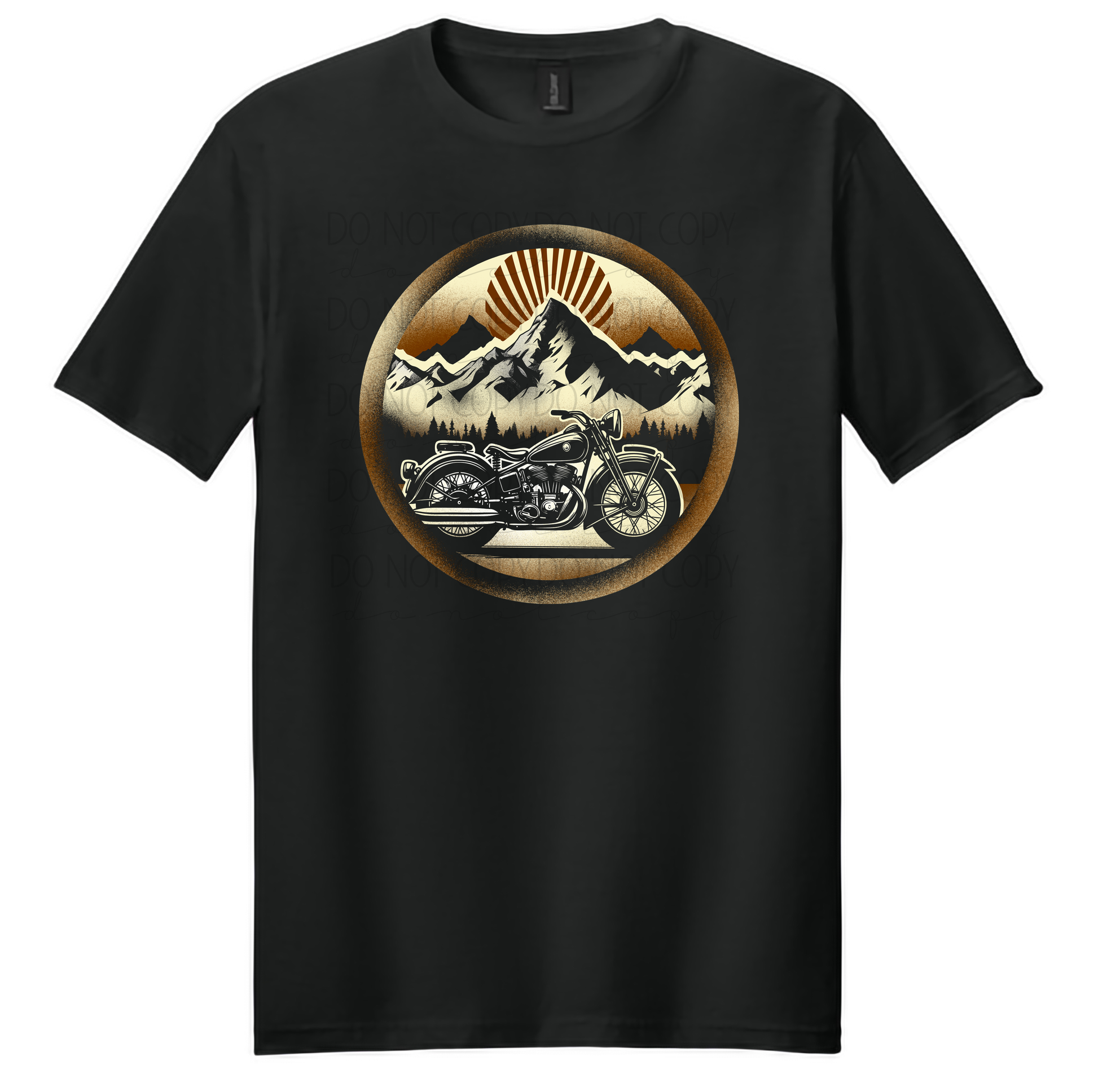 Hit the open road in style with our Vintage Motorcycle & Mountain T-Shirt. Featuring a bold circular design with a classic bike set against towering mountains and a rising sun, this shirt captures the spirit of freedom, travel, and adventure.