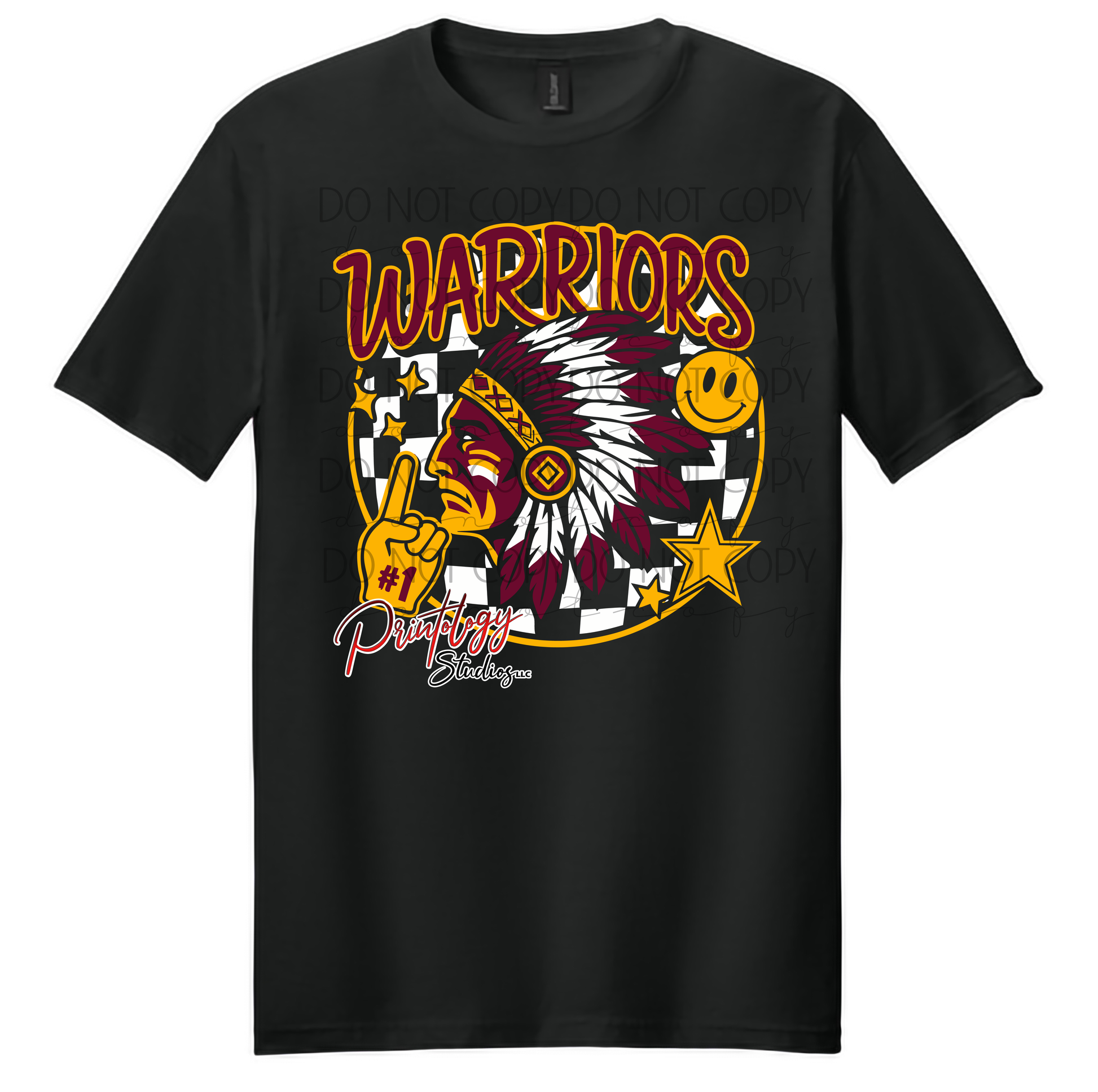 Stand out on game day with this Warriors Blackout Spirit T-Shirt! Featuring a fierce warrior head with a detailed feather headdress, checkerboard backdrop, foam finger, retro smiley, and bold star accents, this shirt captures the perfect mix of cardinal, gold, and black for ultimate school spirit.