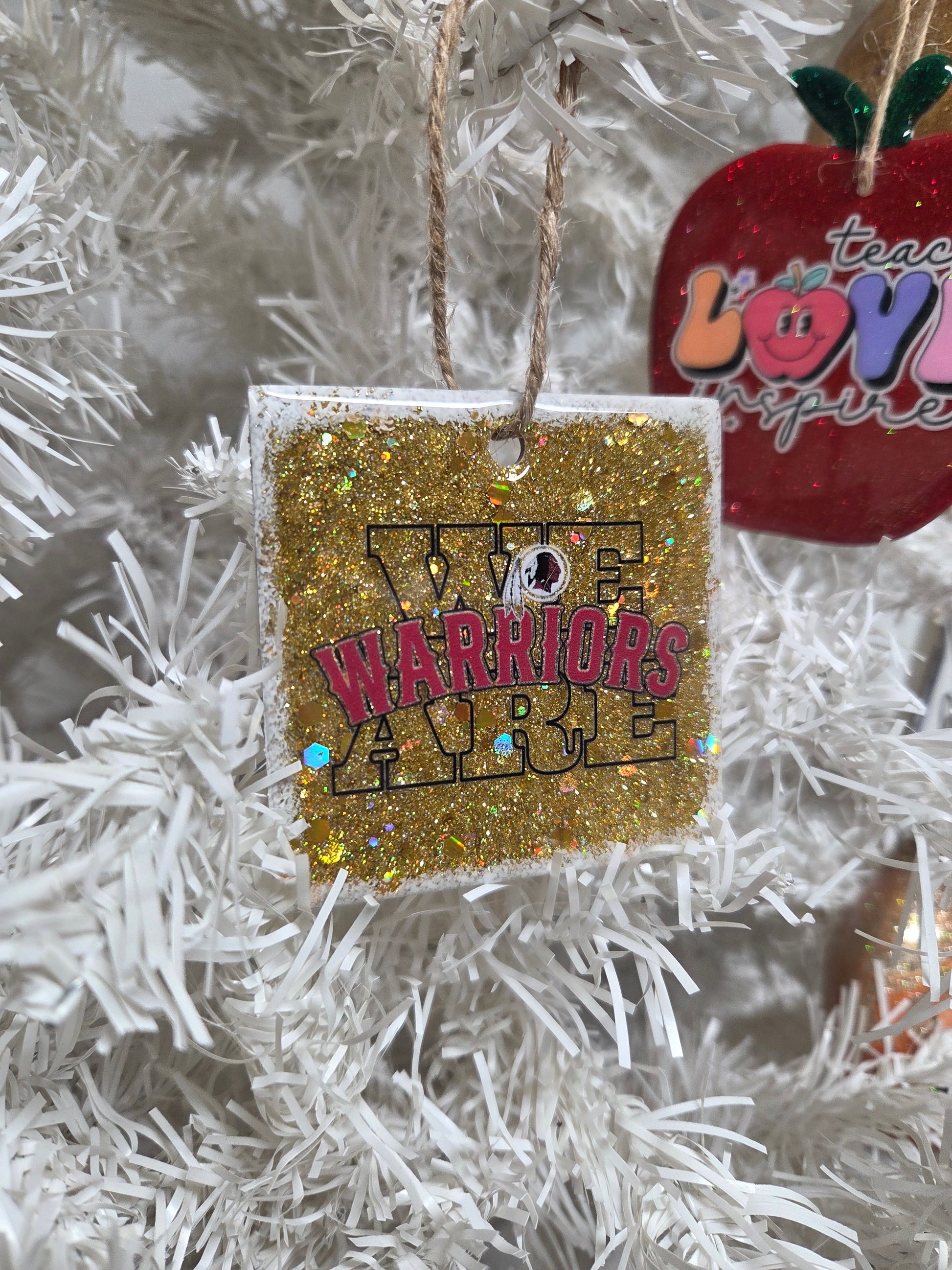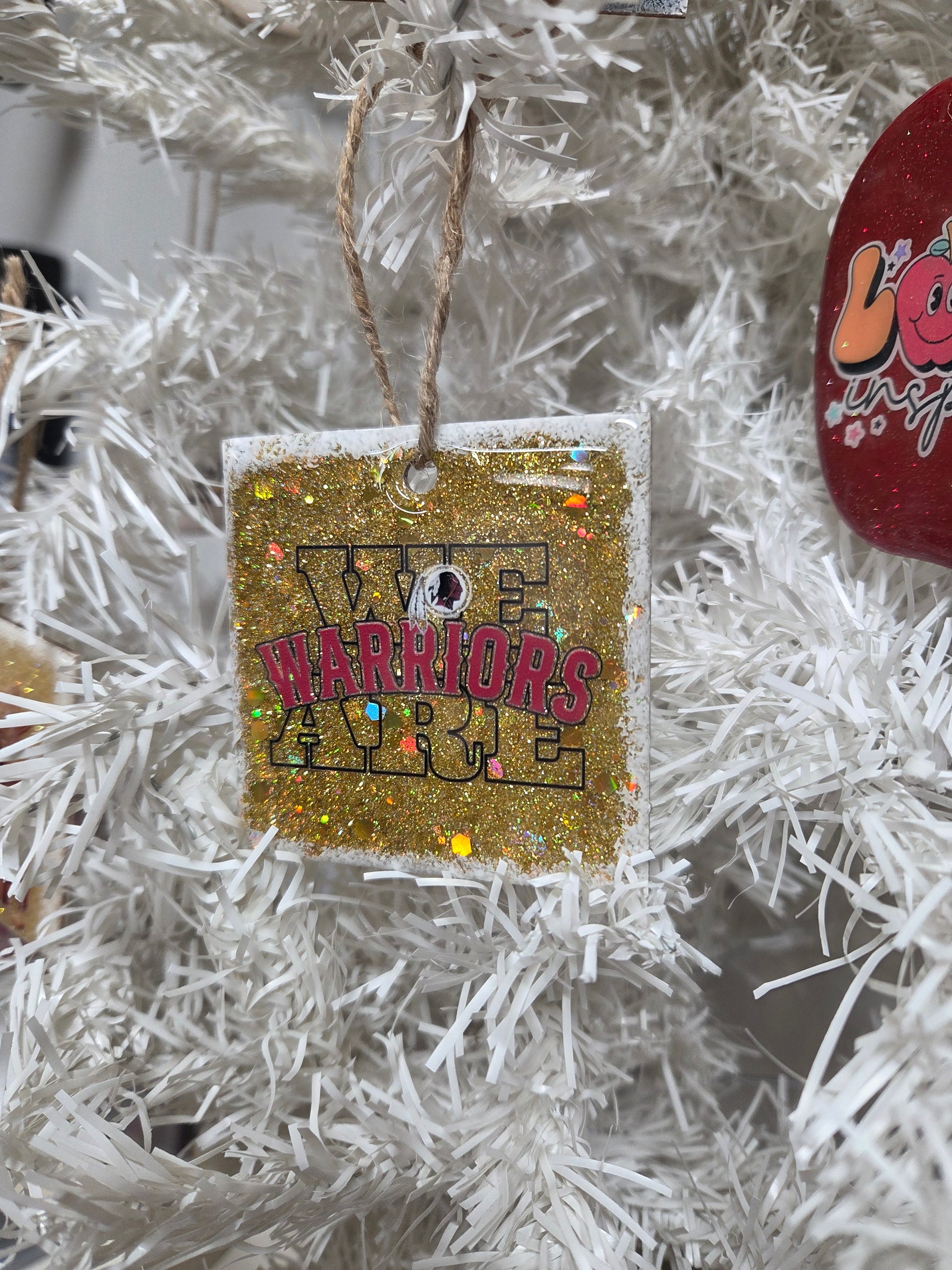 Show your Warriors pride this holiday season with this handcrafted “We Are Warriors” wooden Christmas ornament! Featuring bold cardinal lettering, a detailed warrior mascot graphic, and a stunning gold glitter background, this ornament is the perfect mix of school spirit and festive sparkle.