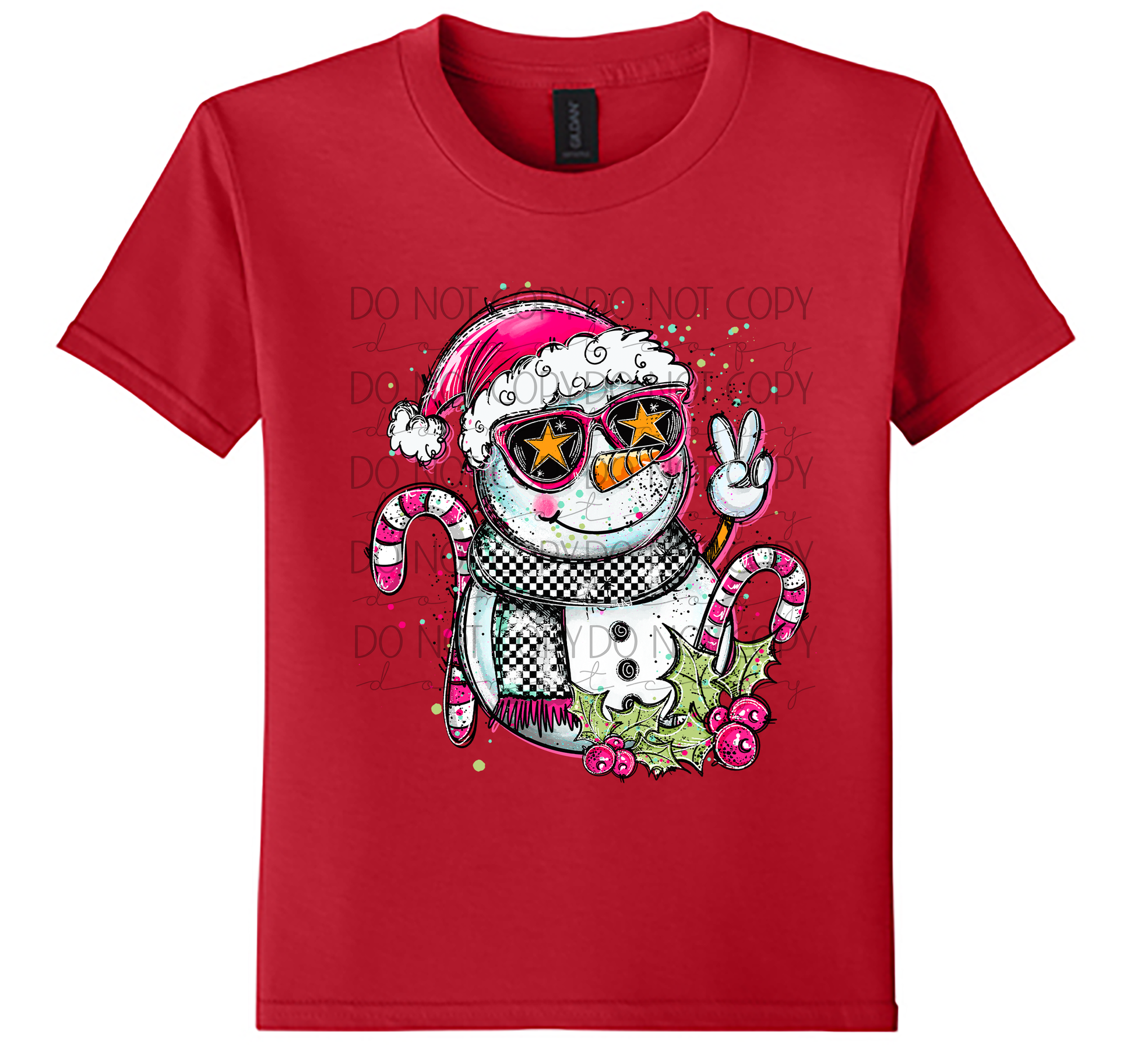 Add some holiday sweetness to your wardrobe with this playful snowman tee! Featuring a cheerful snowman in a Santa hat, rocking star-shaped sunglasses, a black-and-white checkered scarf, and holding candy canes while flashing a peace sign — this design is full of holiday spirit. Holly accents and splashes make it a bold and trendy twist on a classic Christmas look.