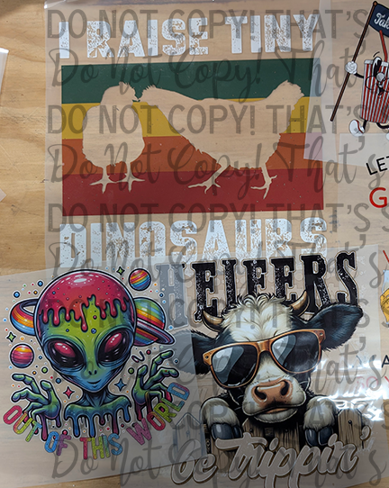 Direct-to-film (DTF) transfers are a modern printing method used to apply vibrant, full-color designs onto fabric. Unlike traditional screen printing, DTF involves printing a design onto a special film using a water-based ink, then applying a powder adhesive to the print. Once heated, the design is transferred directly onto textiles using a heat press. This method is especially popular for its ability to work on a variety of materials—including cotton, polyester, and blends—without the need for pretreatment. DTF is known for its durability, color richness, and versatility in custom apparel production.